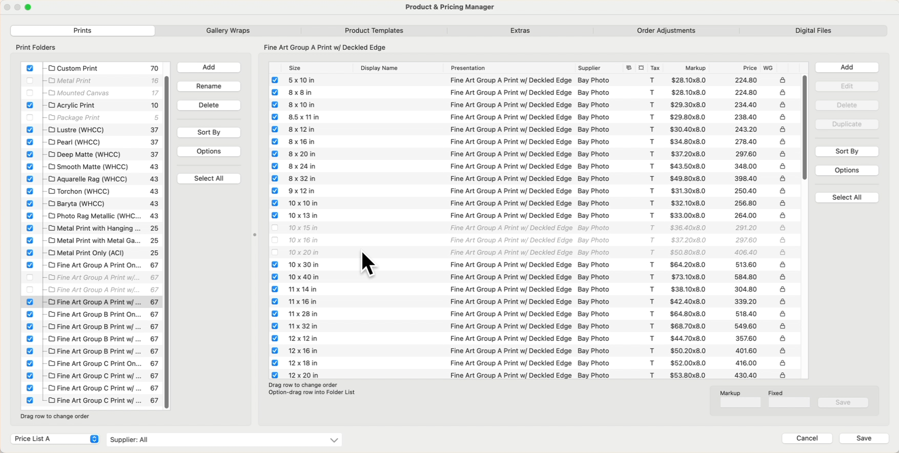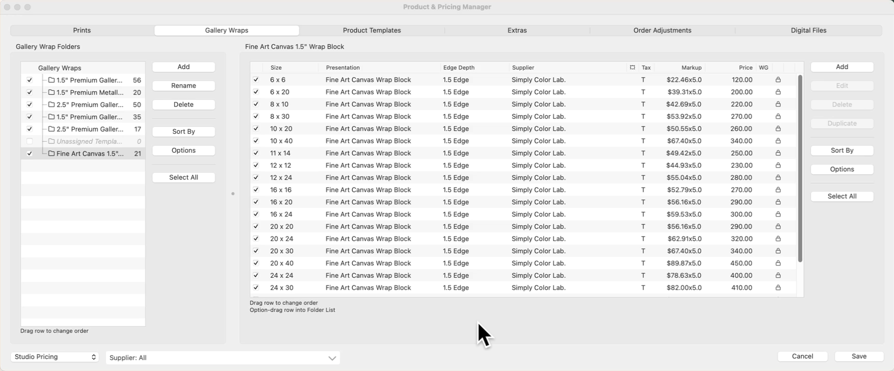 4. Use the Select All button to change the markup value of ALL the gallery wraps within the folder.