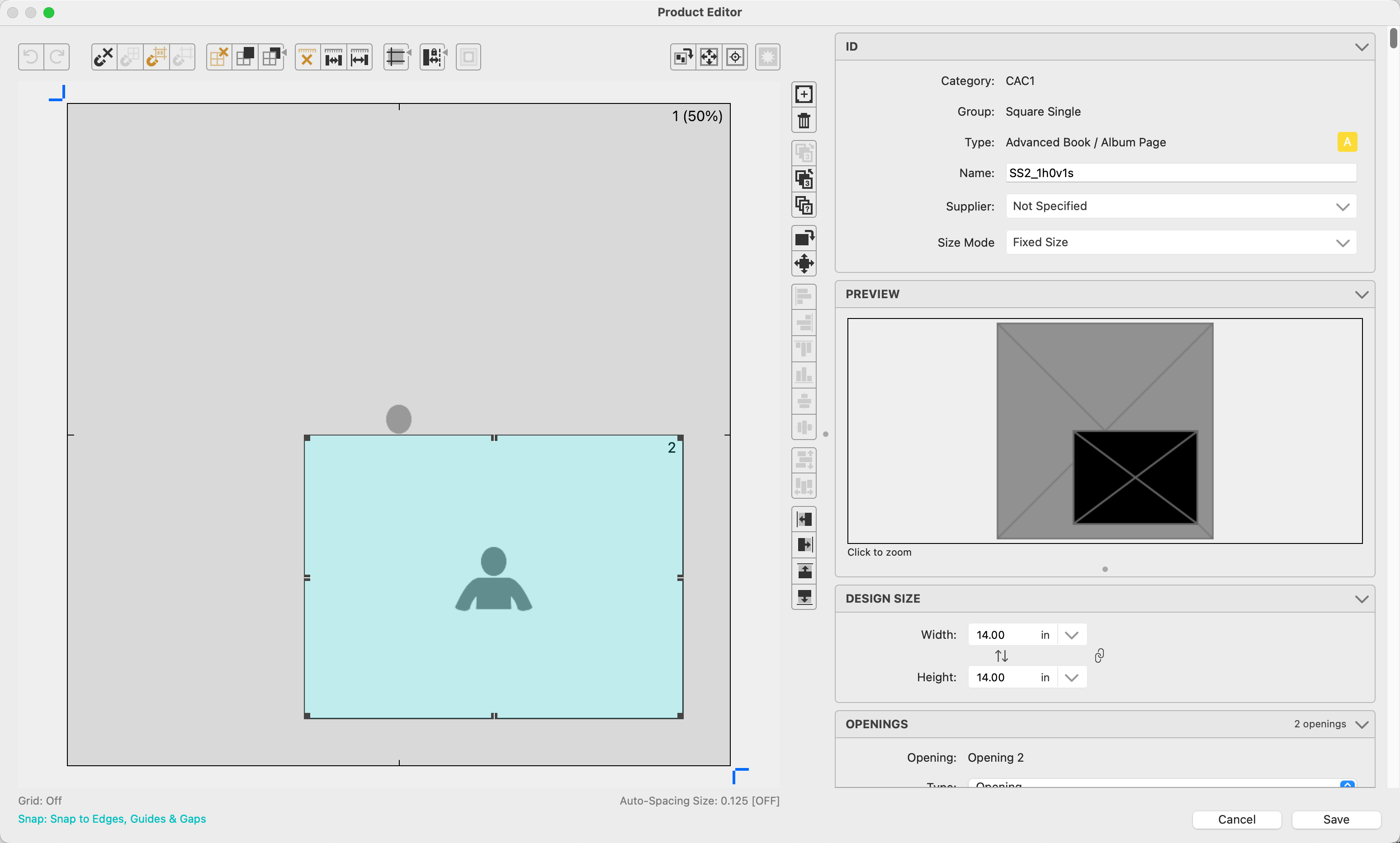- Name: Because these templates are dynamically sized, listing a size in the name is not recommended. Instead, names such as SP1 (Square Page, 1 Opening) might be more useful.
