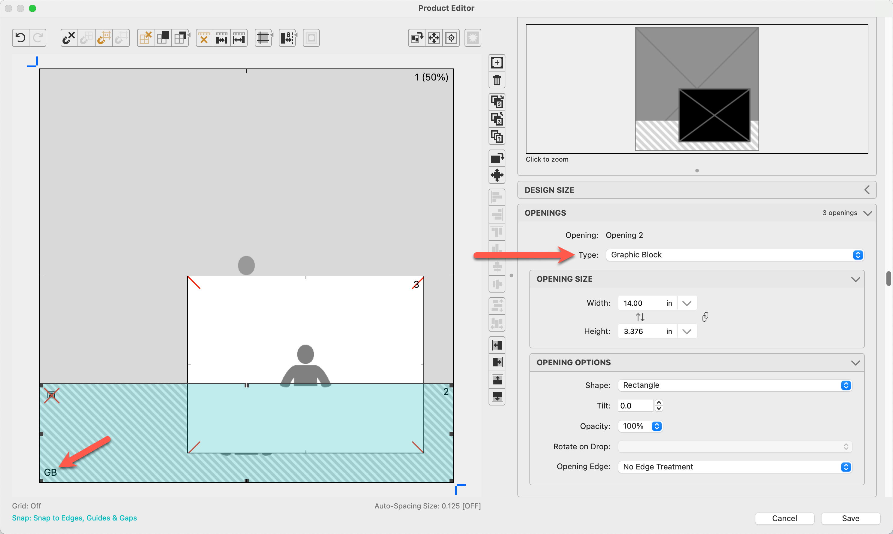 - Type: Openings can be made into a graphic block using the drop-down menu. Please note: graphic blocks by default have no edge treatment selected. Graphic block openings appear with diagonal gray lines in the Template Editing Area as well as a "GB" in the bottom left corner of the opening. This is to differentiate the graphic block from a regular opening.