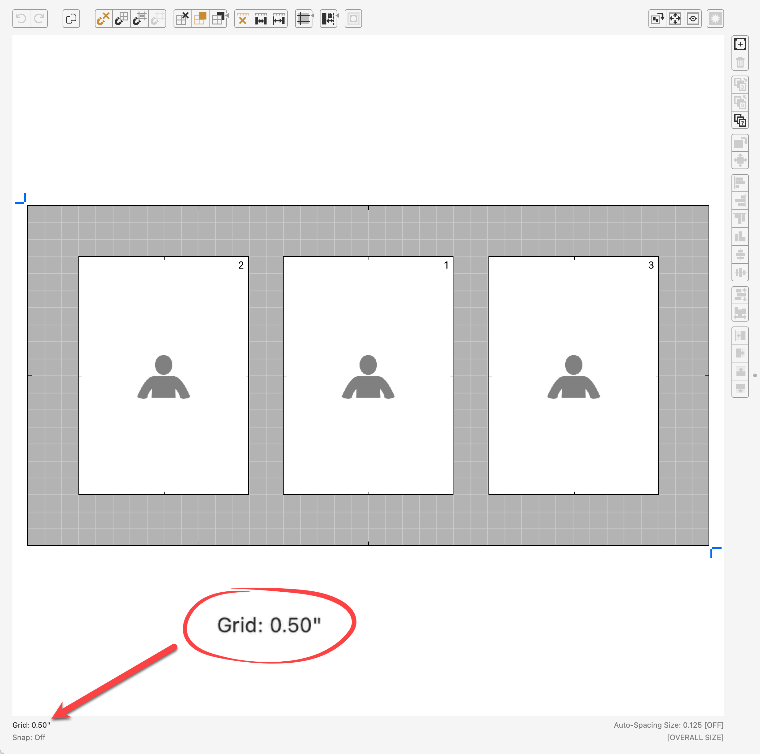 The grid is a series of lines at a set spacing that you can use to place your openings with even spacing within a template.  The grid control buttons are located near the top left side of the Template Editing Area.  Use the "R" key on your keyboard to toggle to the next grid option.