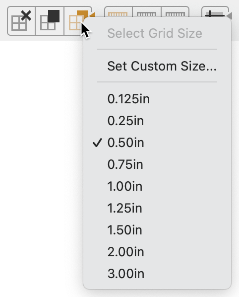 Right-clicking on any of the grid buttons will open the Select Grid Size popup menu.  You can select a Grid Size from a list of common sizes or use the Set Custom Size option to enter your own size.