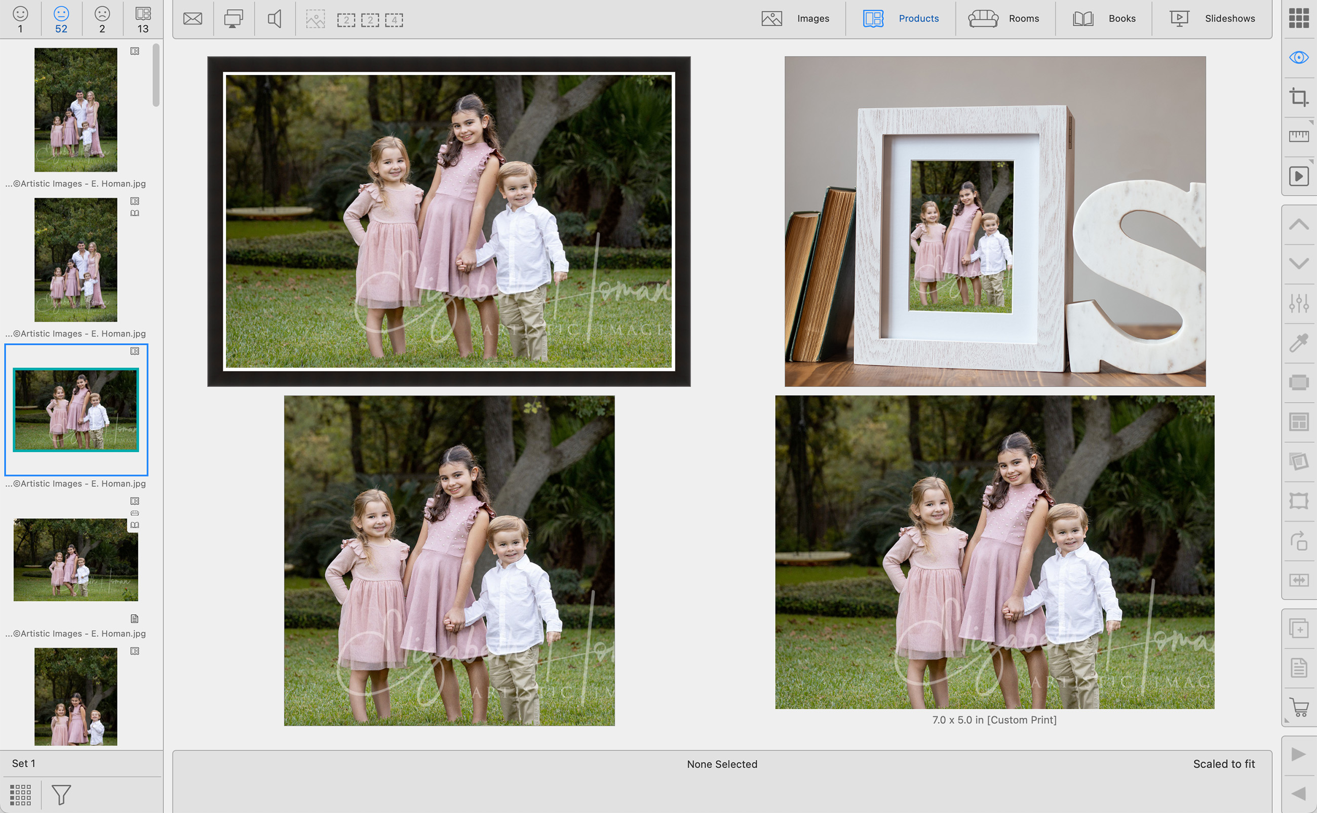 Working with Products is the working with mode where you can build and display prints, gallery wraps, multi-image layouts, specialty products, and wall groupings using product templates. The end result is sellable products for your Client.
