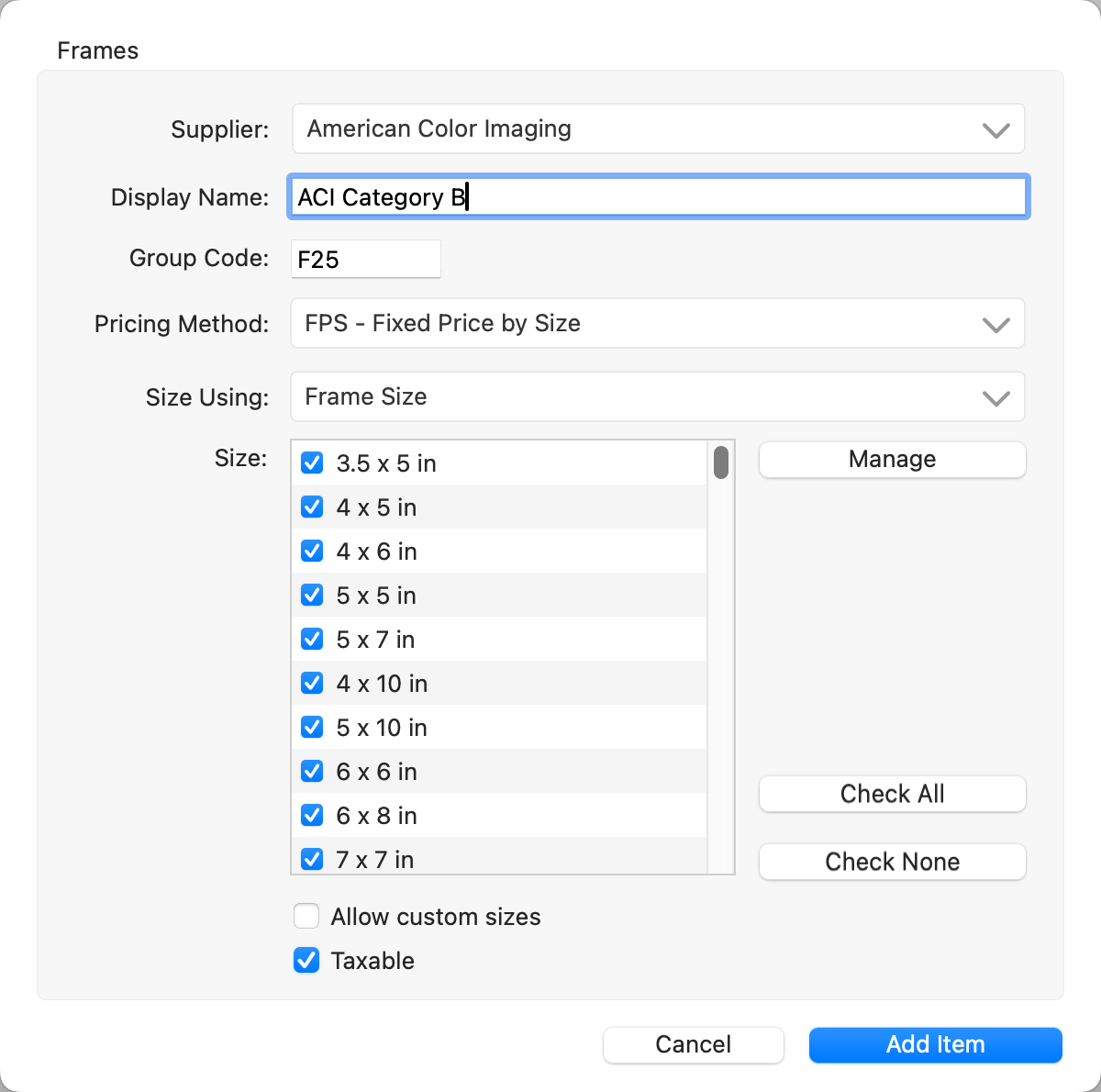 Many suppliers have a predetermined range of frame or mat sizes available, rather than offering custom sizes. By utilizing FPS pricing, ProSelect can indicate which size combinations are available from your supplier, ensuring that you avoid selling items they cannot produce. If your supplier utilizes FPS pricing and offers custom sizing for frames and mats, ProSelect will automatically use the price for the next standard size.
