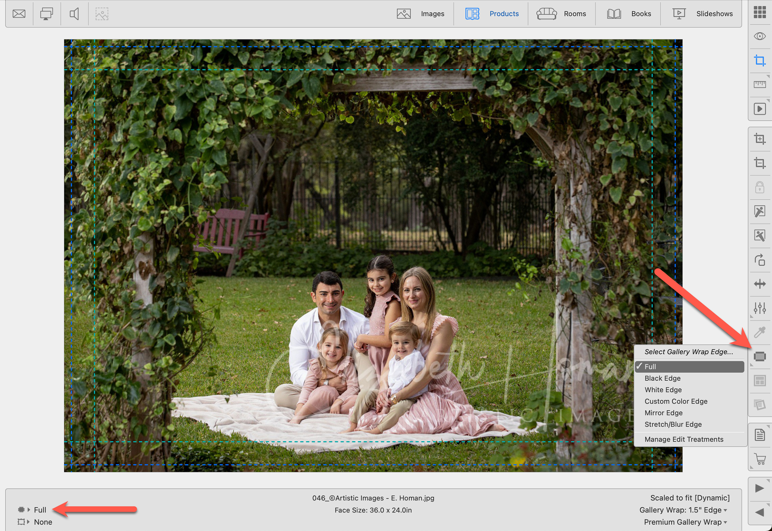 - By default, Gallery Wraps will be created with a "Full Edge." Part of the image will be used to wrap around the sides of the gallery wrap.
