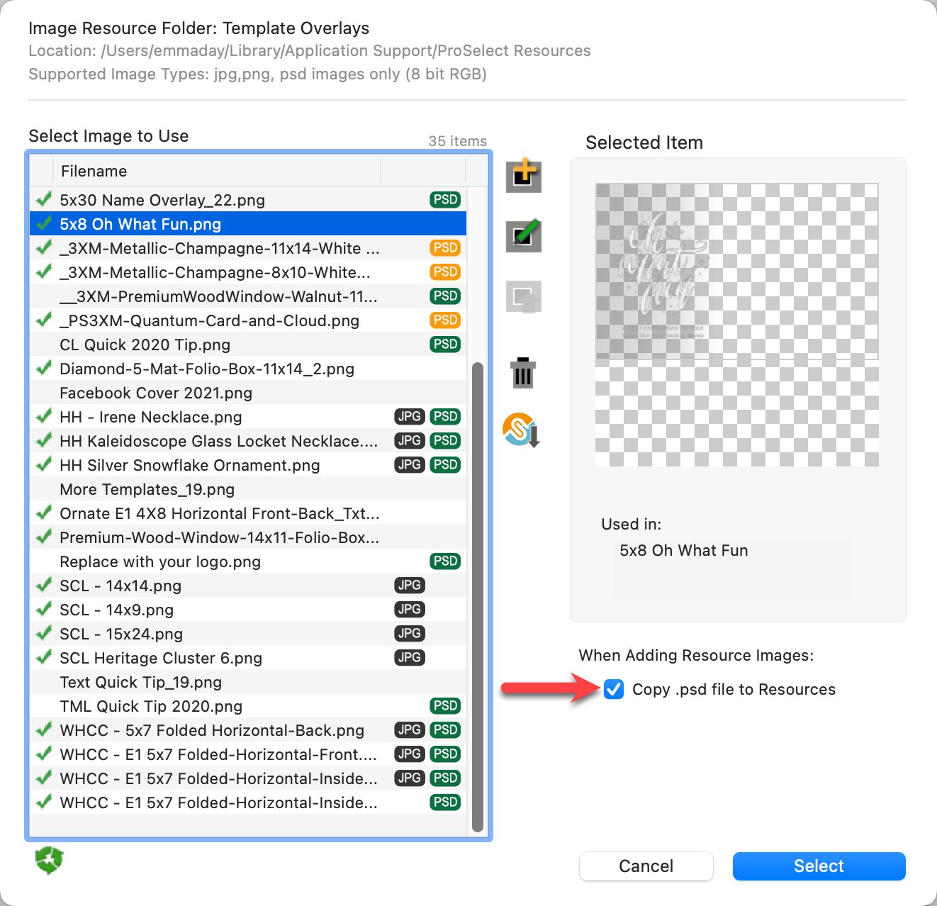 - In the Product Editor, create a new template and add the overlay to it by importing the .psd file. Use the Import using Photoshop option. Make sure that you have checked "Copy the .psd file to Resources." The file will also be added to your Resources folder.