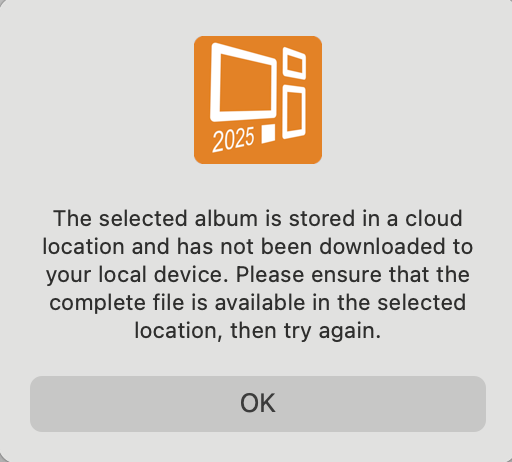 Due to these risks, a warning might pop up when attempting to open an album stored in a cloud location. This warning serves as a reminder to ensure that your files are fully synced and locally available before proceeding with your work to avoid these issues.