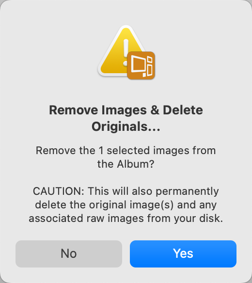 In this case, your original images are not affected as only the low-res copies that you added to the ProSelect Album will be removed. Holding the Shift key down while selecting this option will also delete the original images. See Deleting Original Images.