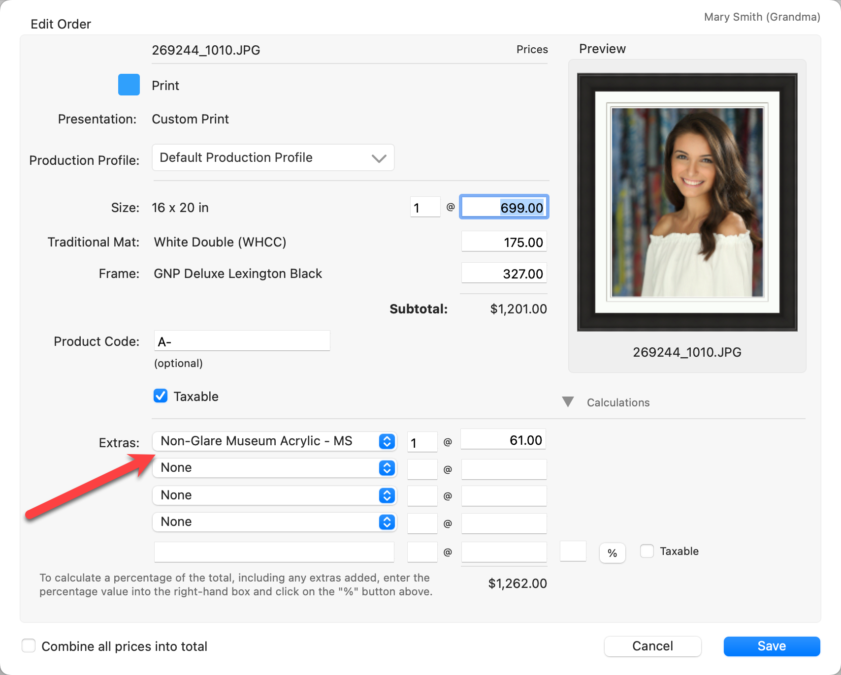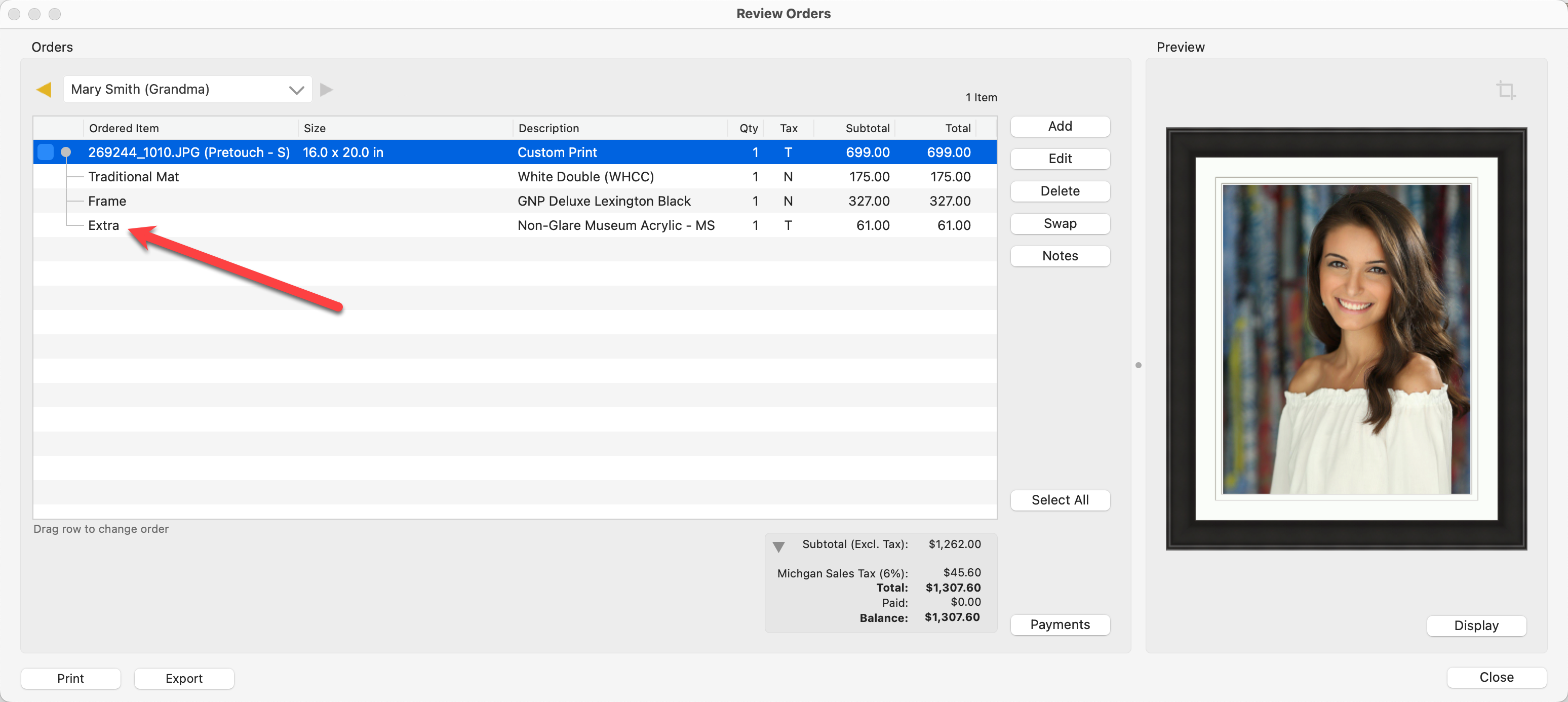 You can add an Extra to a product by clicking on the Edit button in the Review Orders window. Alternatively, when you initially order the product, use the Custom Product option. Each product has room for up to 4 Extras to be added, plus one custom Extra.