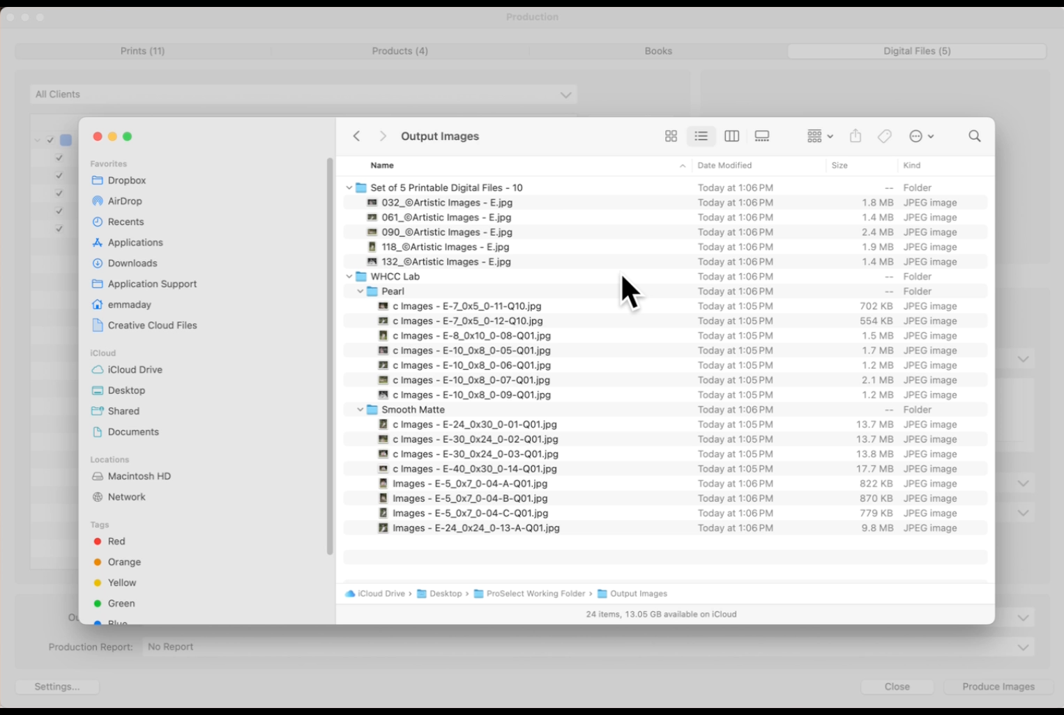 ProSelects Production Module "Pro Production" automates Photoshop to produce high-resolution images for uploading to Labs. When you place an order in ProSelect, it includes everything needed to create the final product, such as the image location, applied effects, cropping, size, notes, virtual styles, mats, and frames.