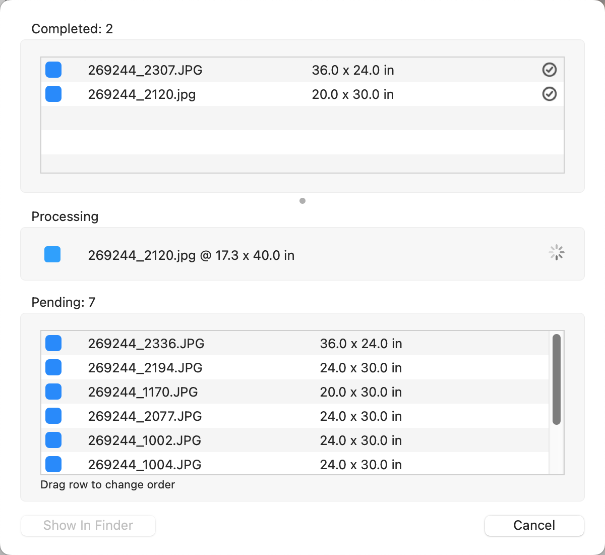 - The Processing dialog keeps track of all images being produced, and where they are in the cue. You can manually drag images to reorder them.