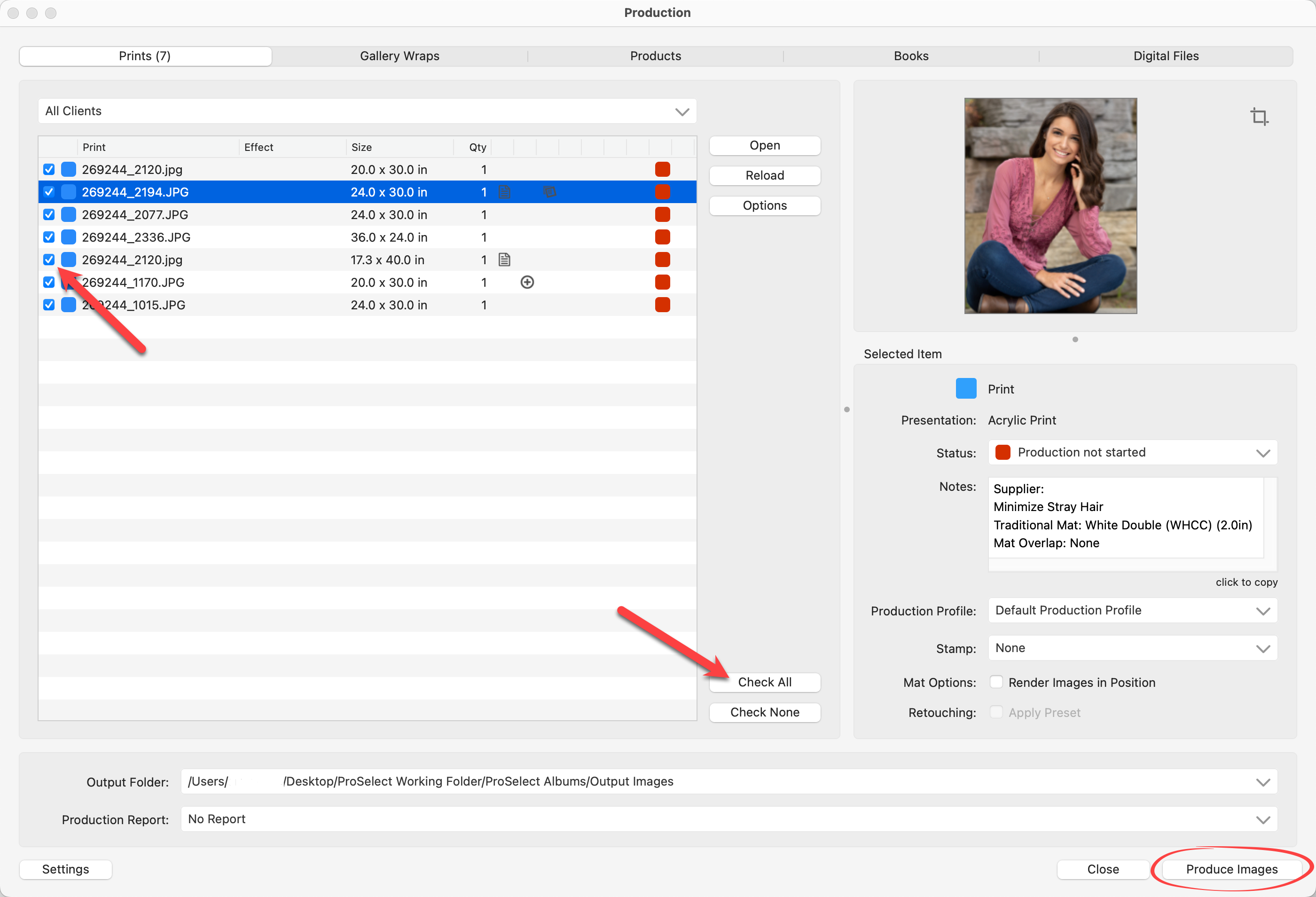 - Check the boxes along the left-hand side for all images you wish to include when creating high-res images. You have the option to "Check All" or "Check None." Do this for each Product Tab. Alternatively, hold down the OptionAlt key while clicking the Check All button. This will check the boxes in ALL tabs.