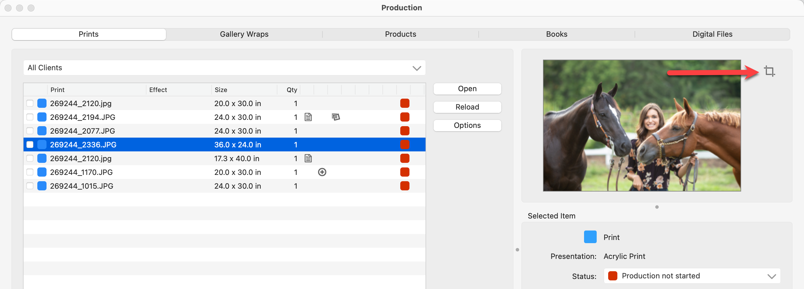 to adjust the cropping of any images. *Cropping needs to be done within ProSelect, not an external Photo Editor. Once you have made cropping adjustments, right-click on the image and select "Go To Production" from the list. This will bring you back to the Production window.