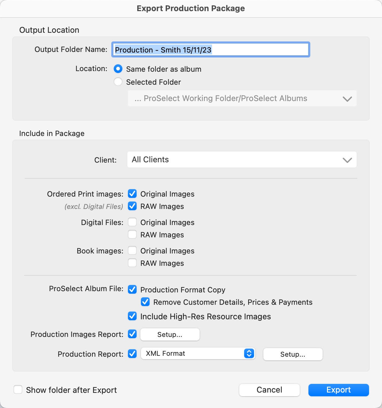Production Packages in ProSelect (Pro version only) facilitate easy transfer of image and data files to an external retouching service. Go to the top menu, Production > Export Production Package. This feature allows you to export a folder named after the current album (prefixed with "Production -"), which you can rename as desired. This folder typically includes ordered original images whether used in prints, product templates, digital files, or books as well as any associated raw files.