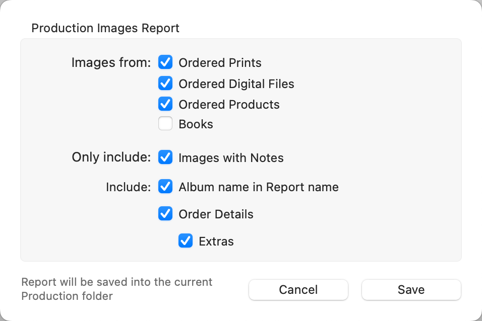 The Production Images Report can be exported as a text file along with the Production Package. In either format, there's an option to list only images with added notes, allowing retouchers to concentrate on those specific images.