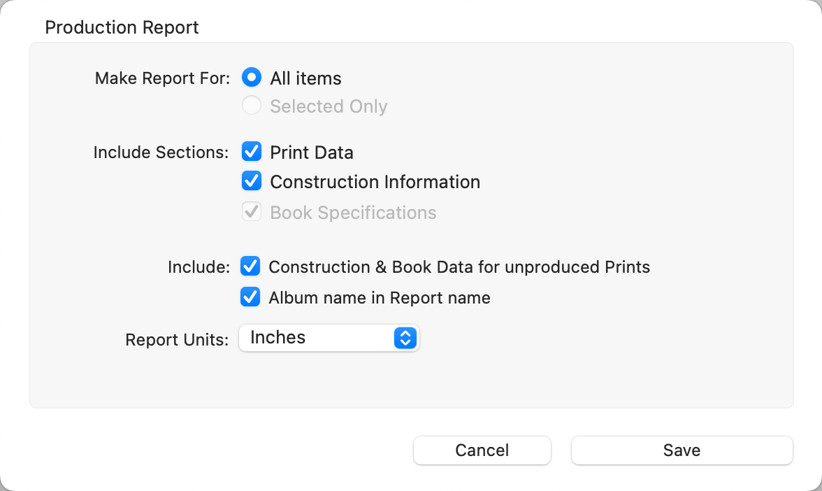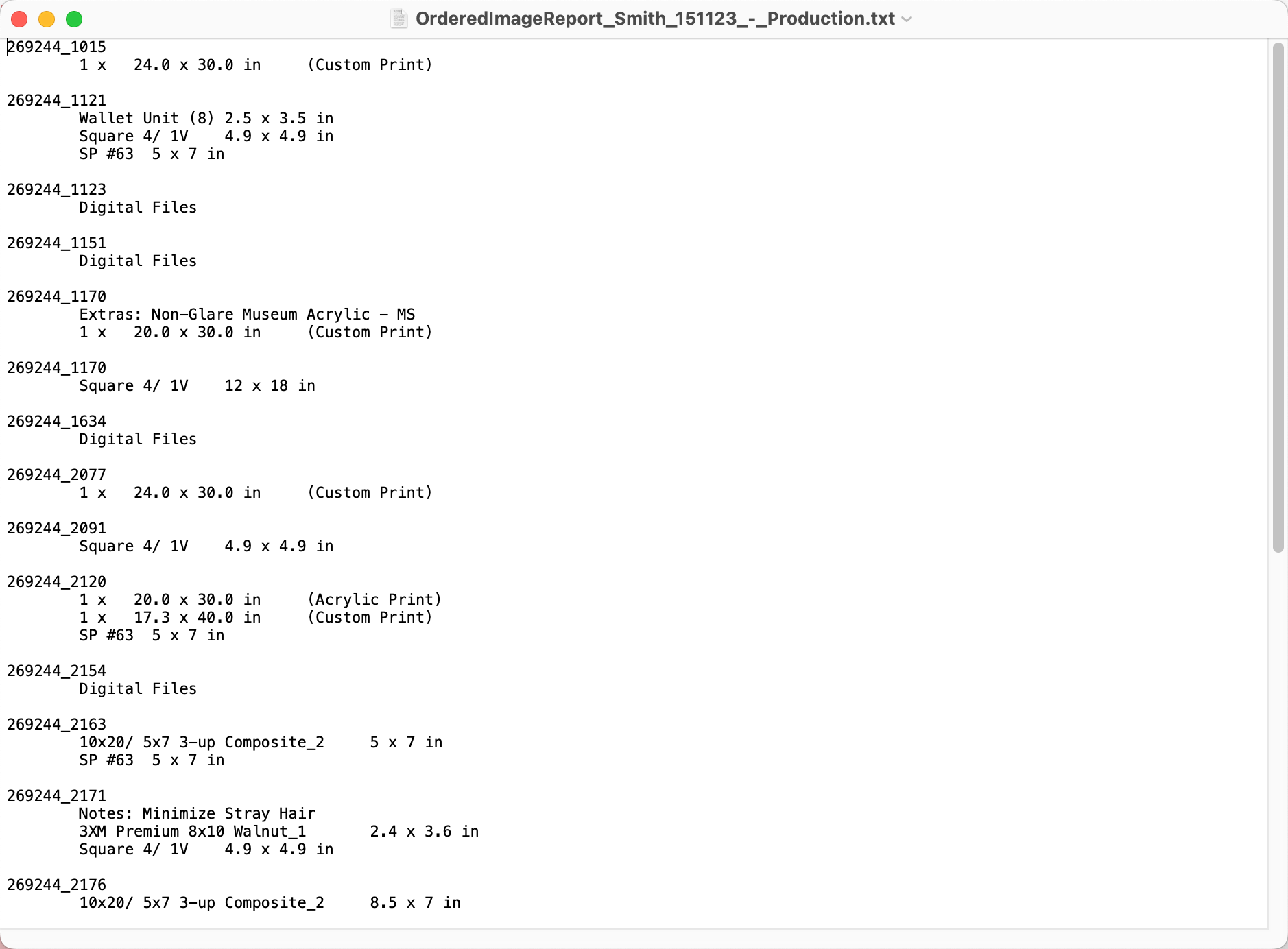 When printing the report (File > Print > Production Images Report), you have the flexibility to choose which client orders to include and whether to incorporate thumbnail images. These options are not available for the text file report exported in the Production Package.