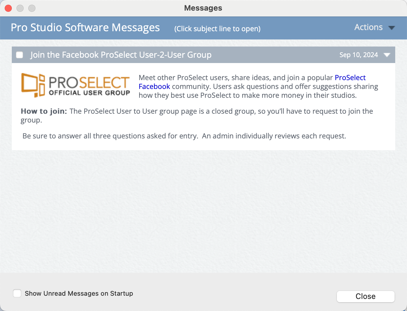 - You can opt to have unread messages automatically displayed upon starting ProSelect by checking the box "Show Unread Messages on Startup."