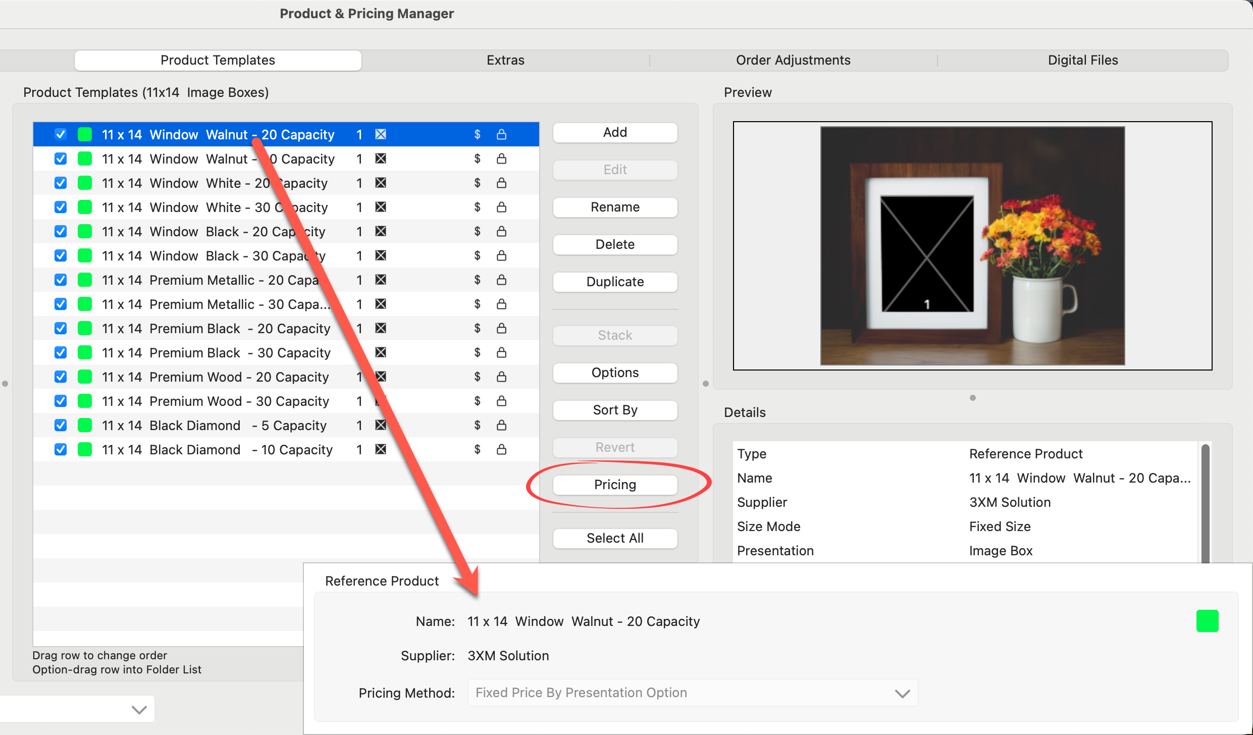 Price your reference products by selecting a template, and clicking on the Pricing button. Reference products are priced using "Fixed Price by Presentation Option".