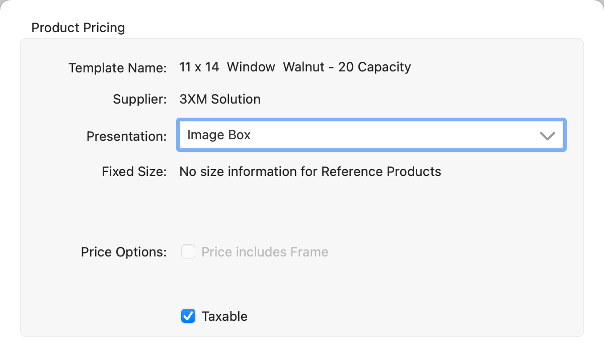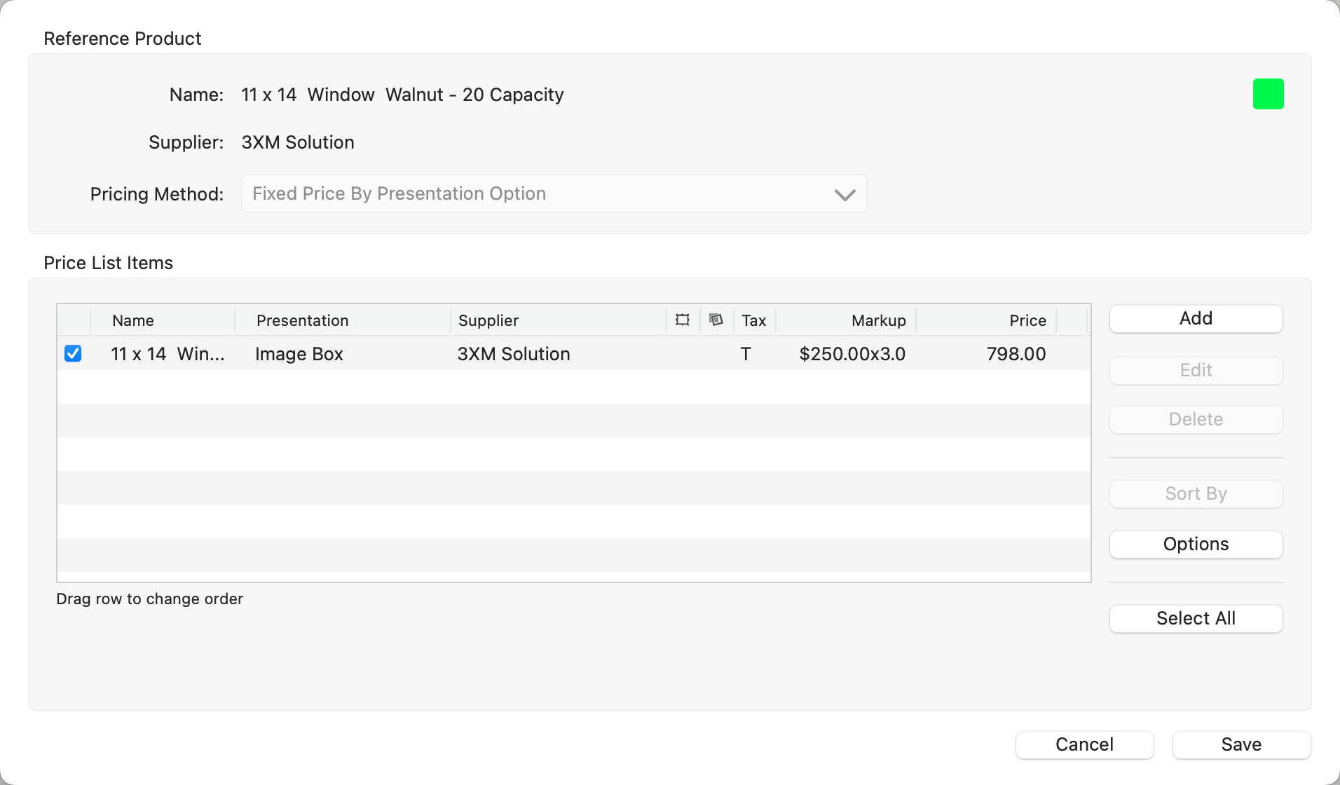 Reference Products must use the "Fixed Price by Presentation Option" method. Each product can have multiple price list items if applicable. Note there is no sizing for reference products, as they are for reference only. No image is being produced.
