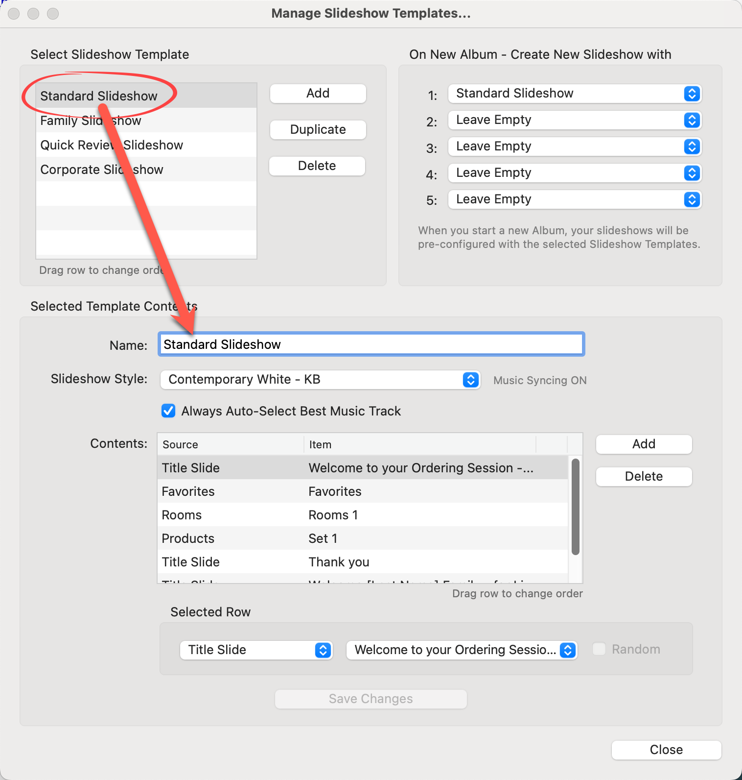 6. The newly saved slideshow template has now been added to the Slideshow Templates list.  You can access it for future use in other albums.
