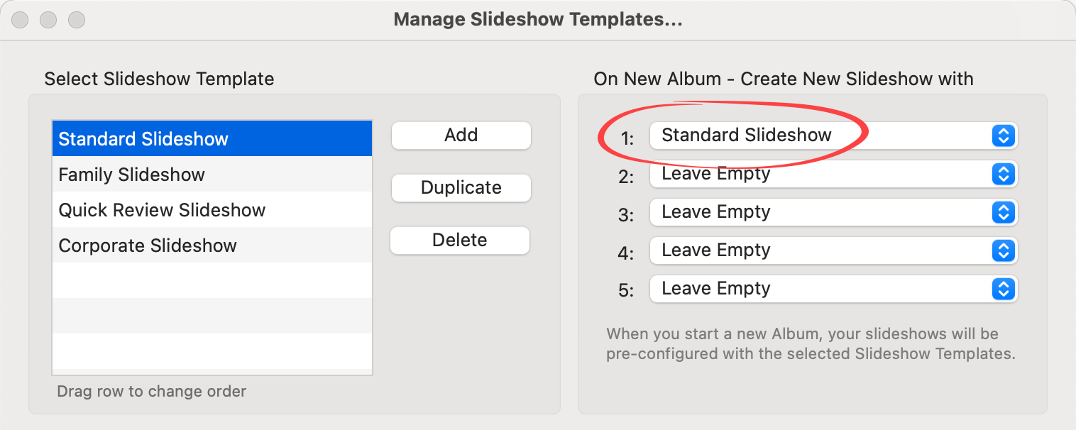 • Slideshow Templates can be set up to automatically populate new albums with a predefined slideshow.
