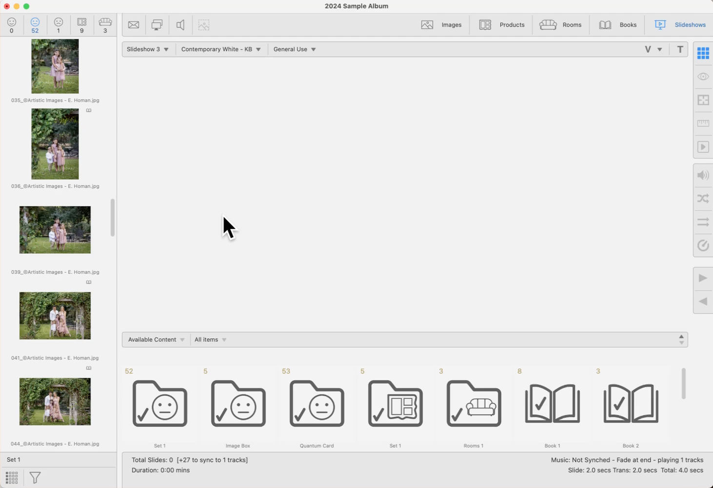 • ProSelect Basic allows for the use of 1 slideshow template to be created on a new album.