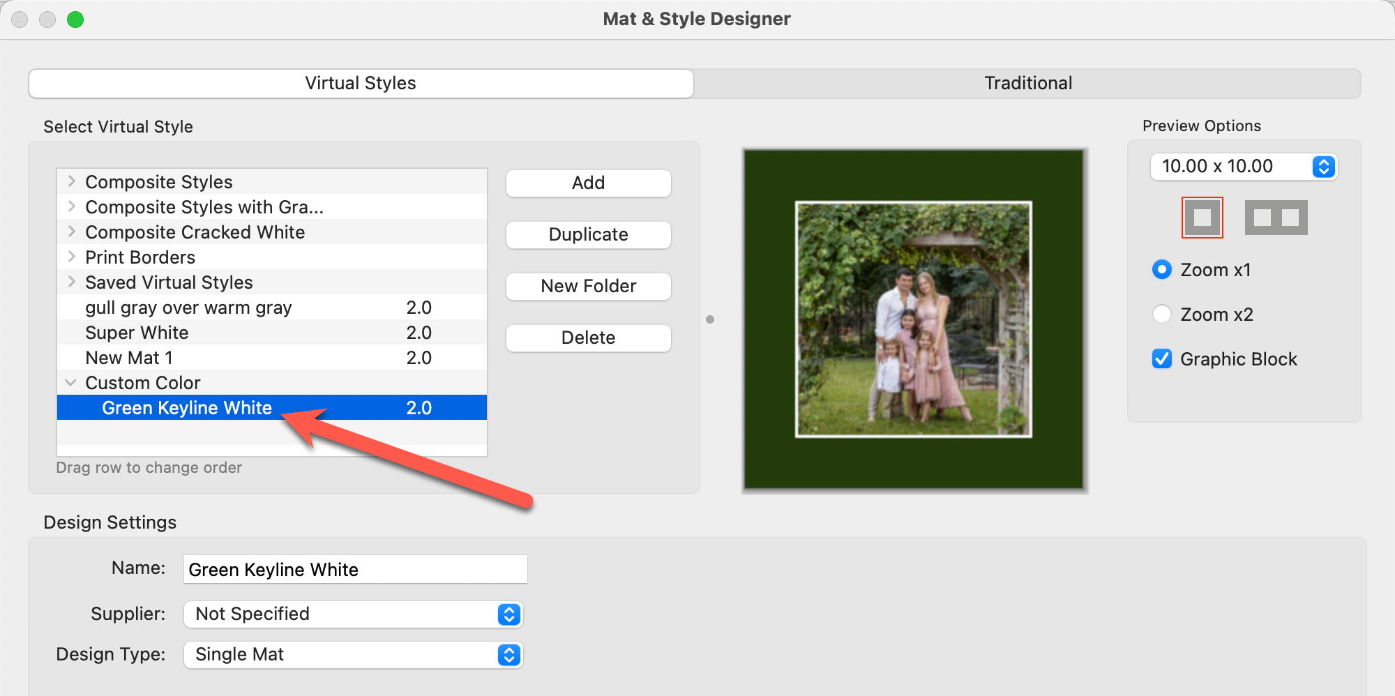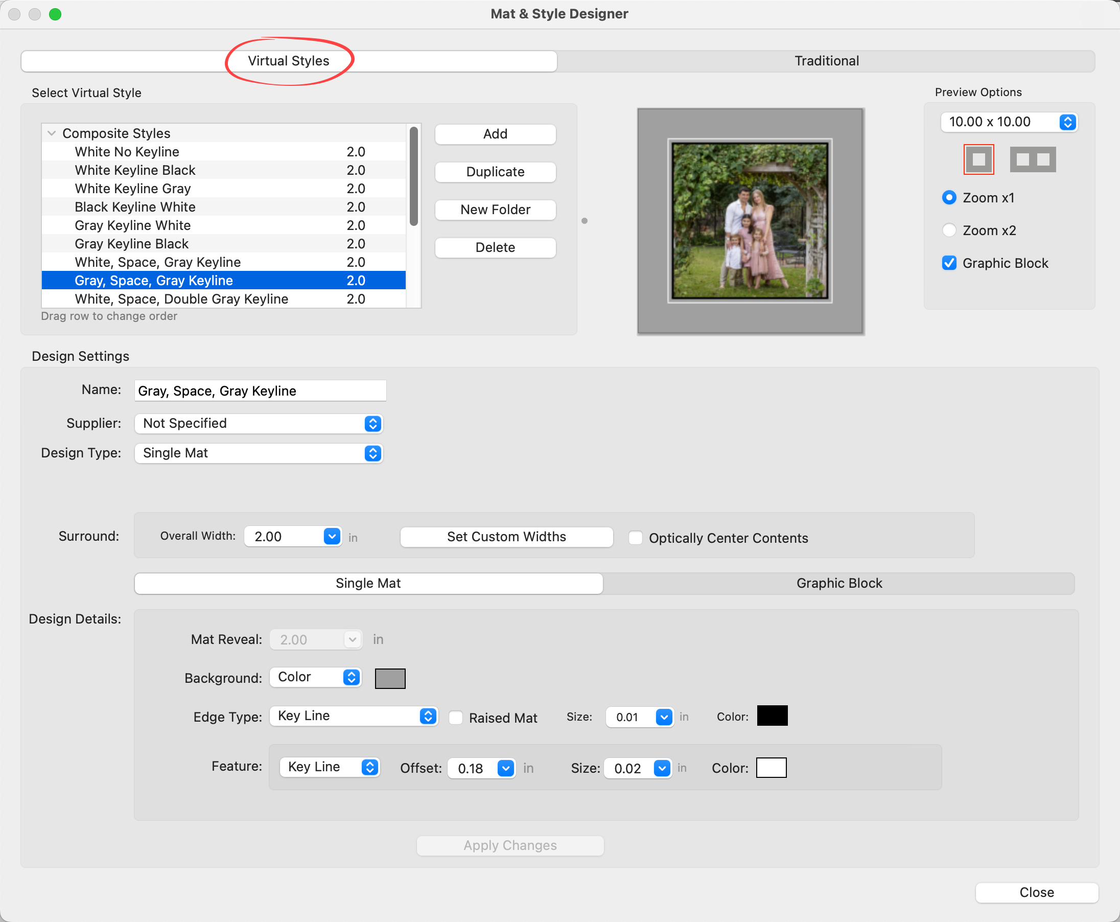 - There are two tabs in the Mat & Style Designer. Be sure to select the "Virtual Styles" tab to work with Virtual Styles.