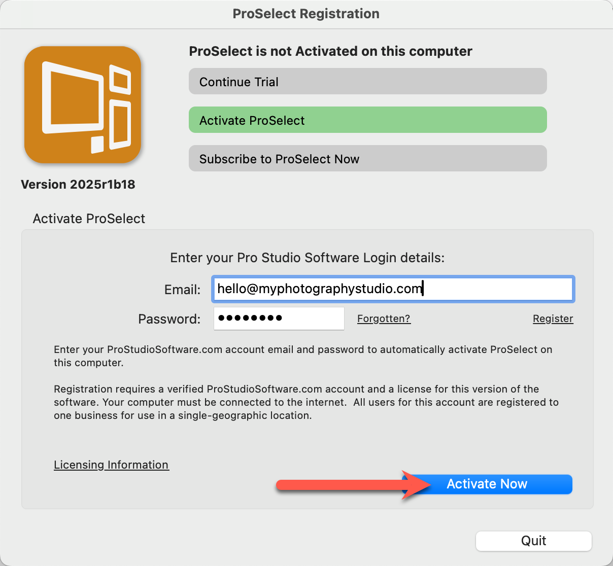 2. Select "Activate ProSelect" and enter your Pro Studio Software login details.