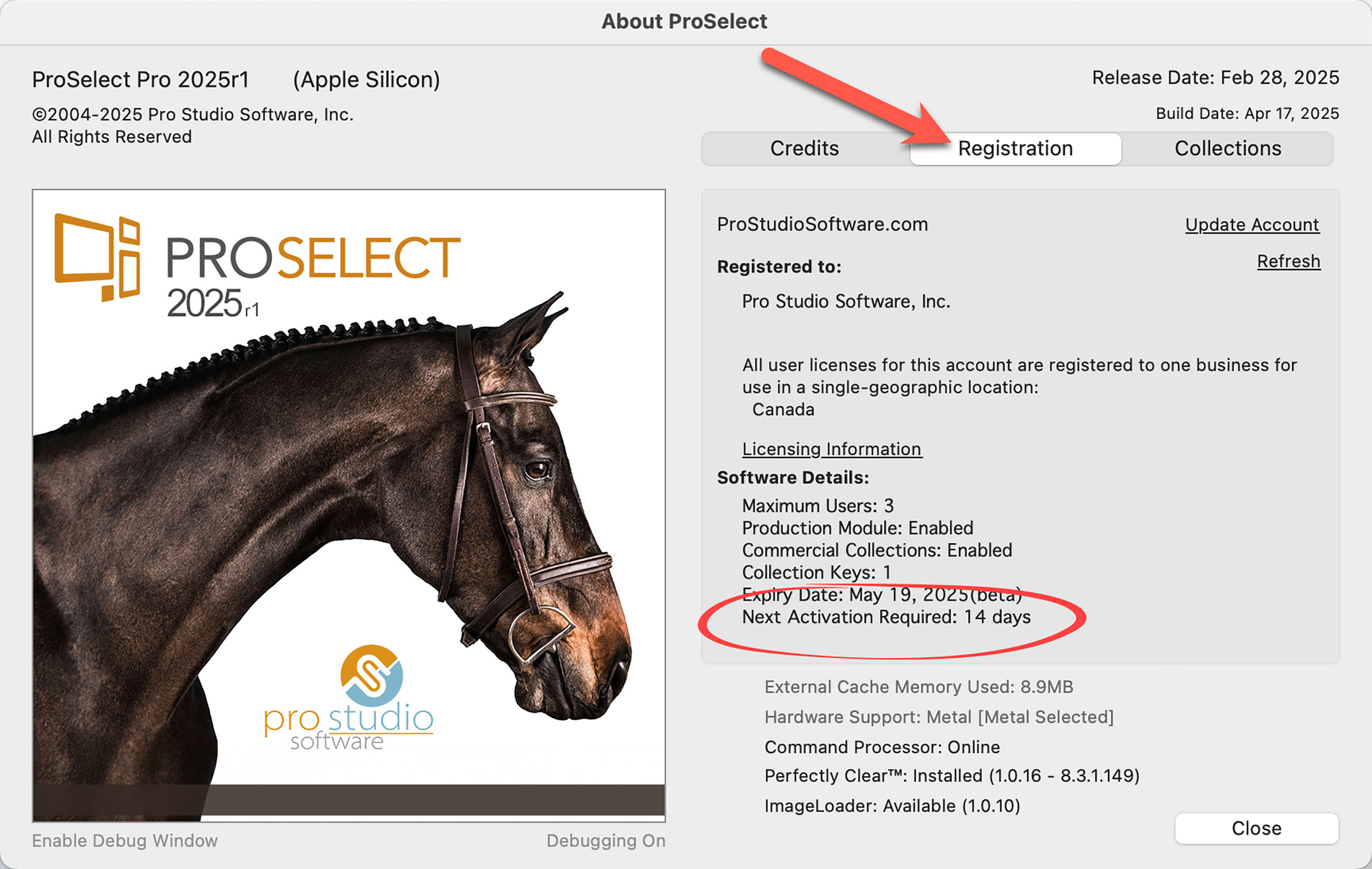 Your ProSelect subscription is linked to your business name and includes details such as the number of users and any additional features you've purchased.  You can review your current subscription details and activation status by opening the About ProSelect dialog.  Go to the top menu, ProSelectHelp > About ProSelect.  Select the Registration tab.  This section provides a clear overview of your registration and activation status at any time.