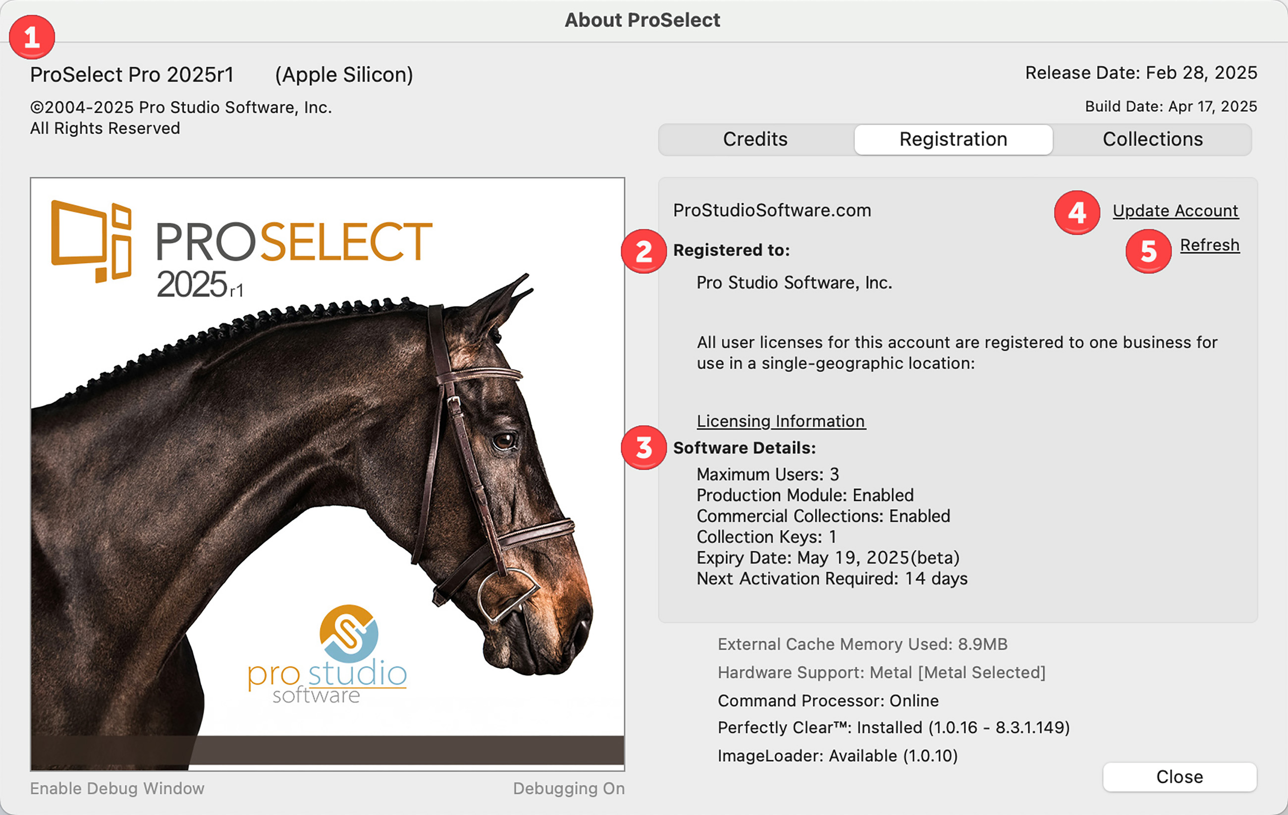 1. ProSelect Pro 2025r1: In the top-left of the dialog, the version of ProSelect currently installed and processor information are listed.