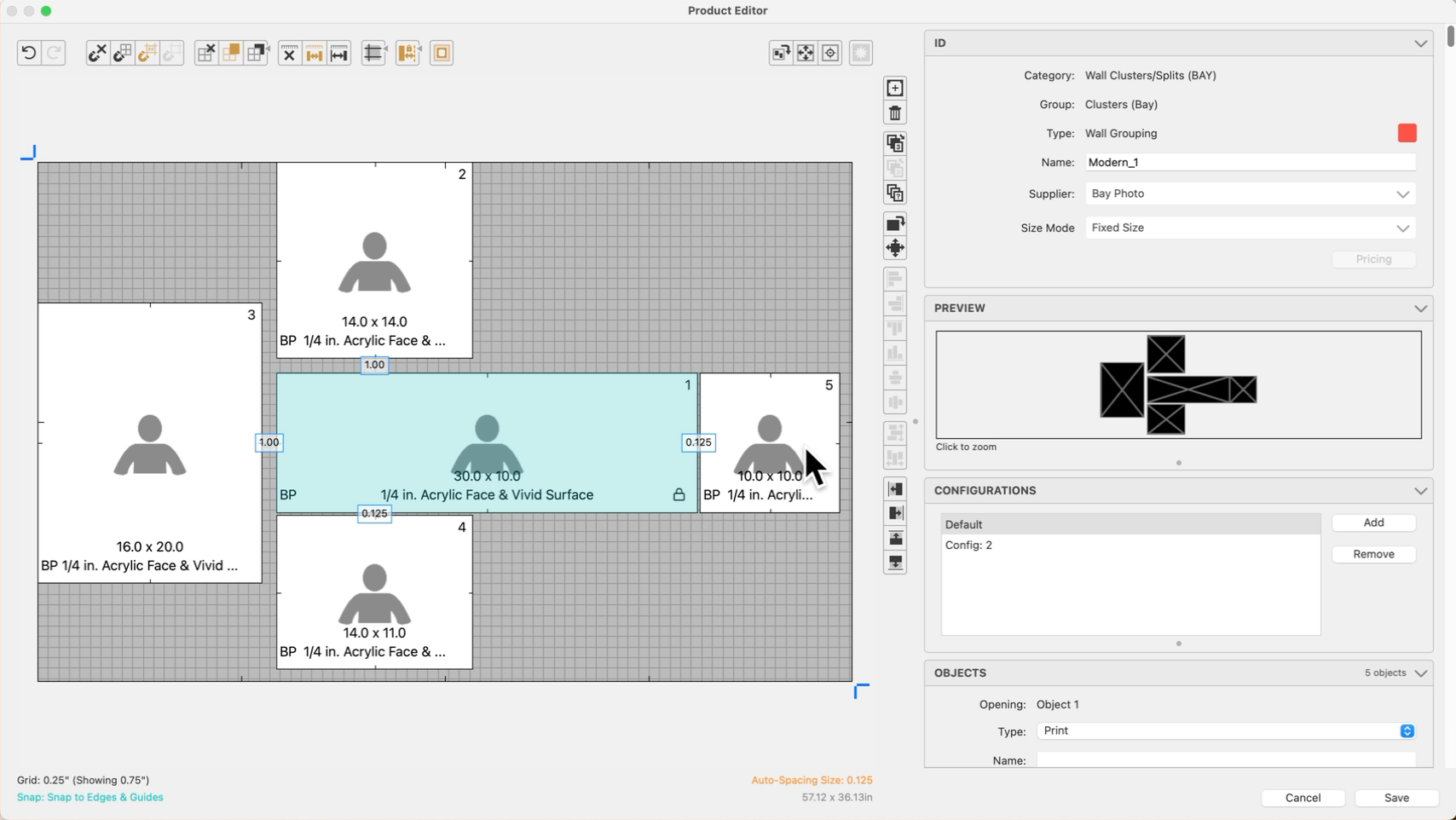 When designing wall groupings or multi-opening templates, maintaining consistent spacing and alignment is critical. ProSelect allows you to lock the size and/or position of any image opening to prevent accidental changes during template editing. If both size and position are locked, both actions will be disabled for that opening.