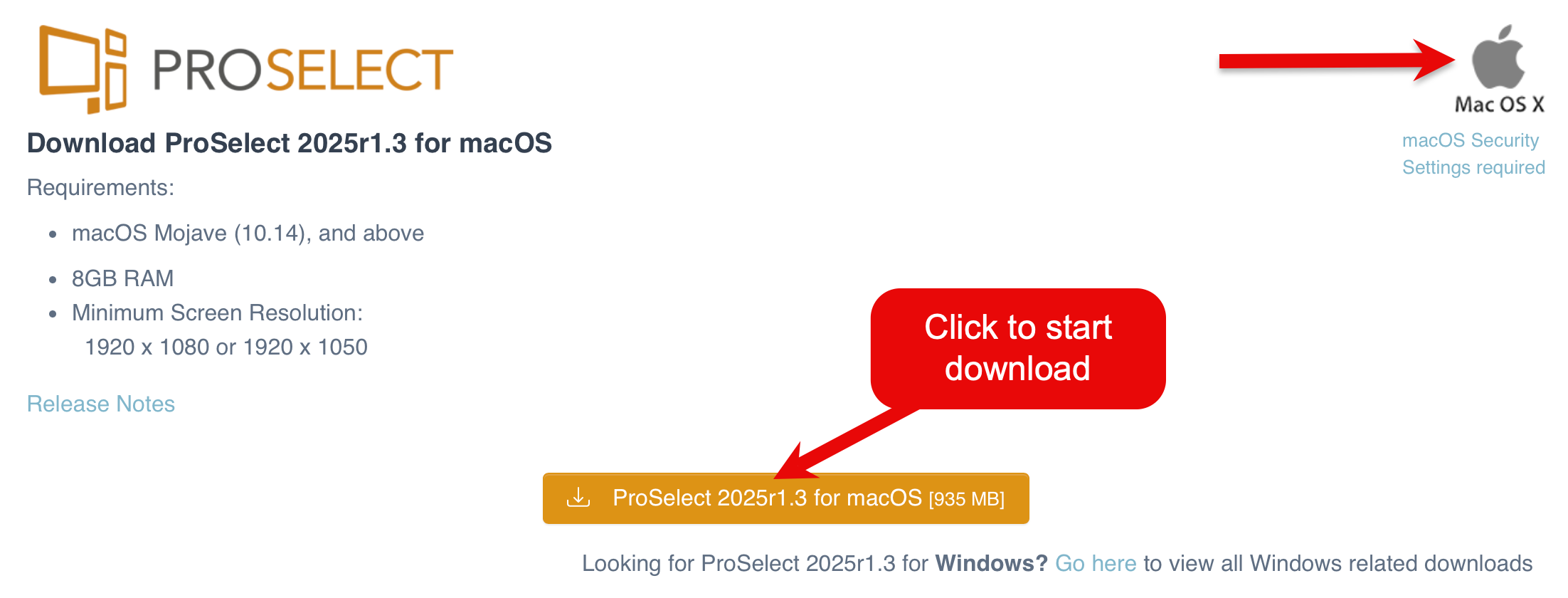 - If you are on a Mac, below the Apple logo is a link to macOS Security Settings required to use ProSelect. Click that link, and a new window will open with information regarding those settings. You'll need that information after you install. Click on Allowing Permissions to learn more.