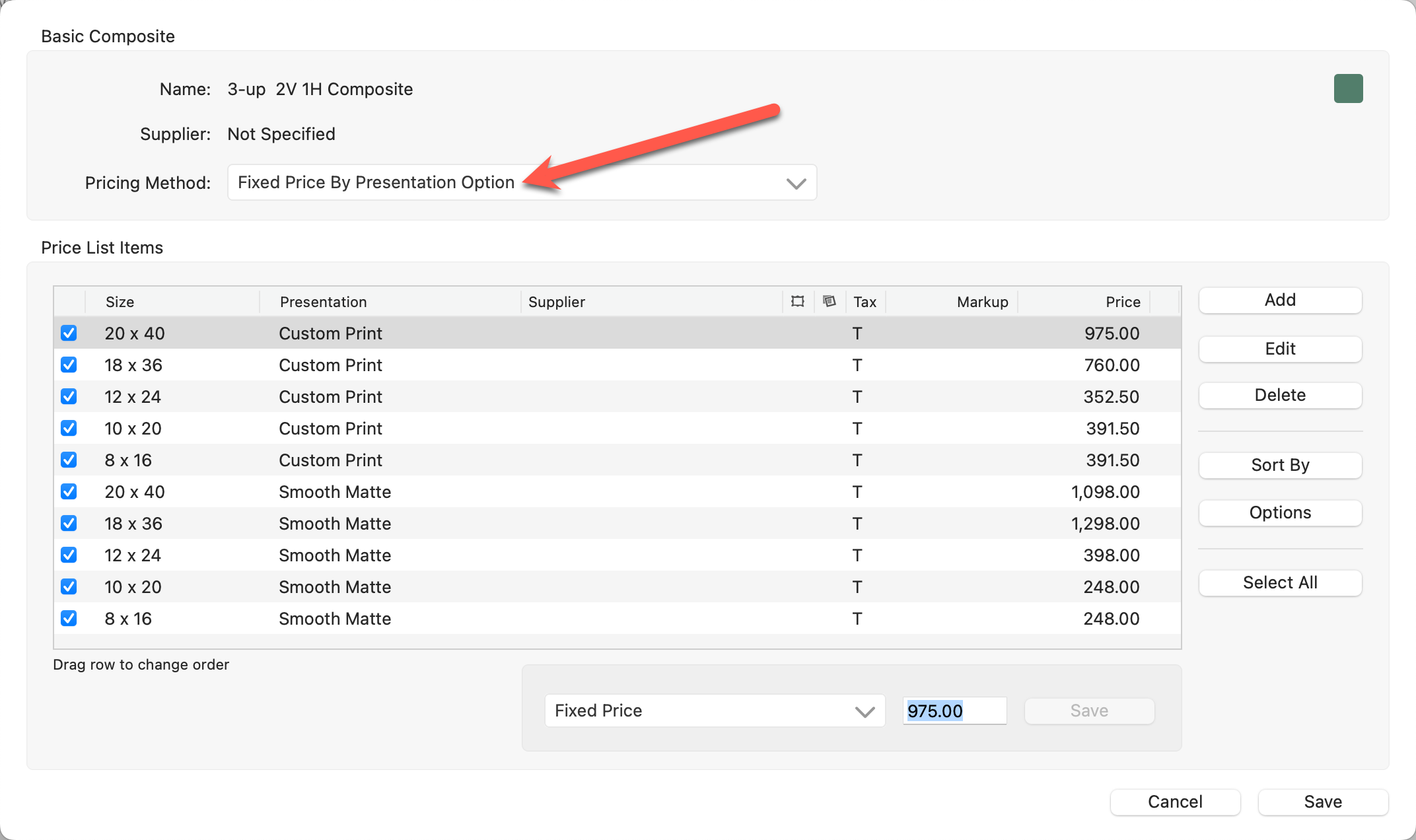 1. Fixed Price by Presentation Option:  With this method, you set a specific price for each combination of size and presentation options available for your product.  This method only allows the sizes and presentation options you directly set up in the Pricing dialog.