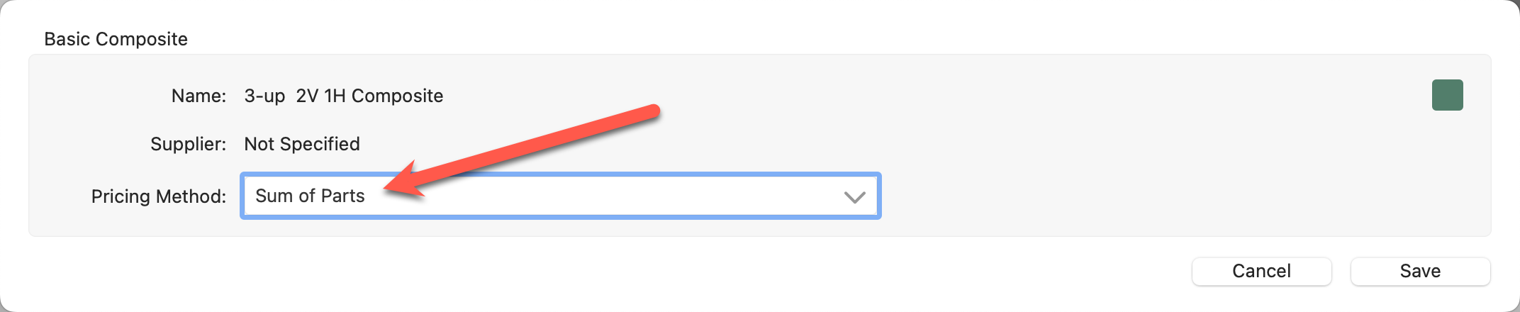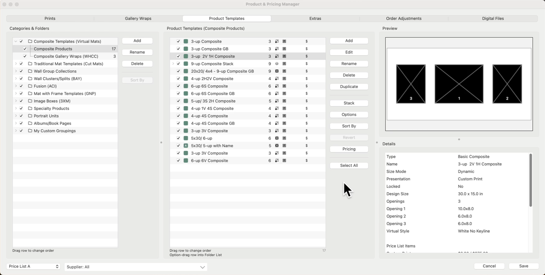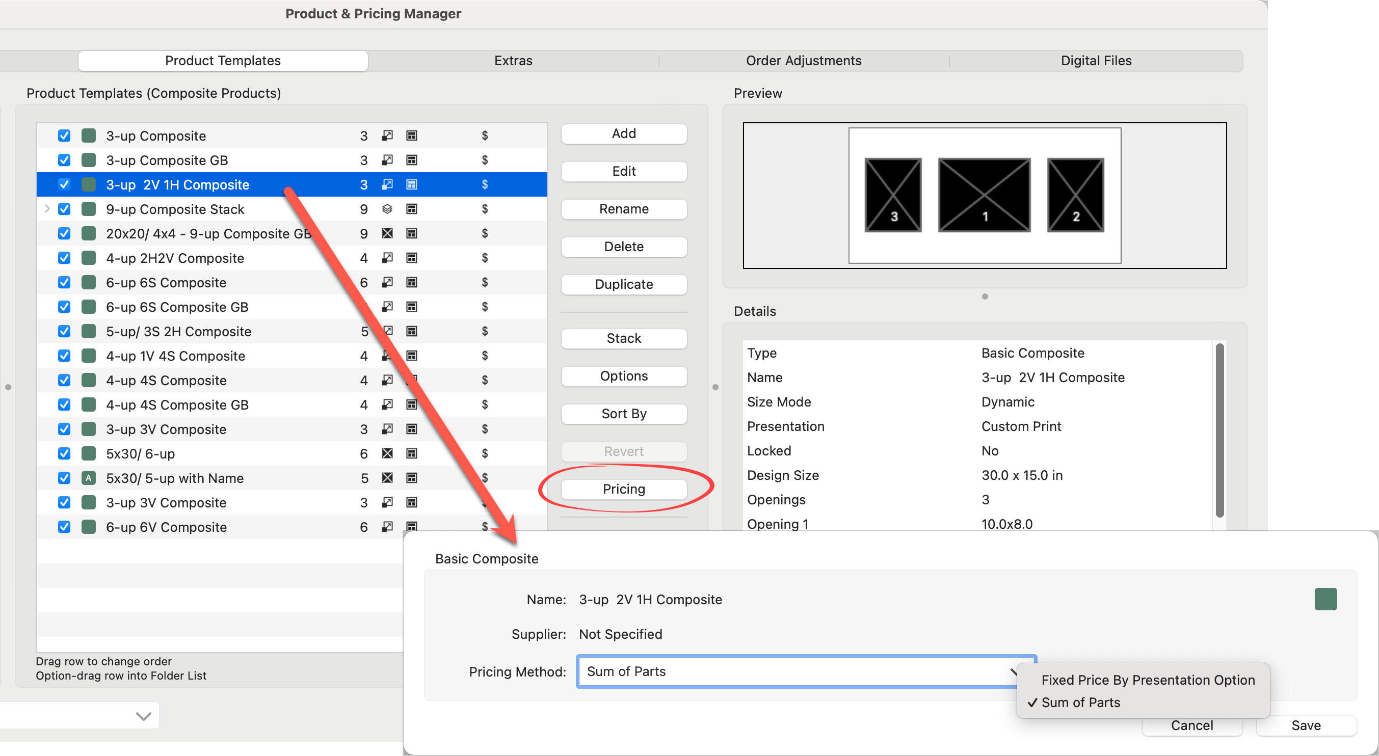 Pricing your composite, advanced gallery wrap, and specialty products begins with first selecting a template, and then clicking on the Pricing button.  All of these products types can be priced as either "Sum of Parts" or "Fixed Price by Presentation Option".  The following examples use composite products, but the methods are the same for all 3 product types.