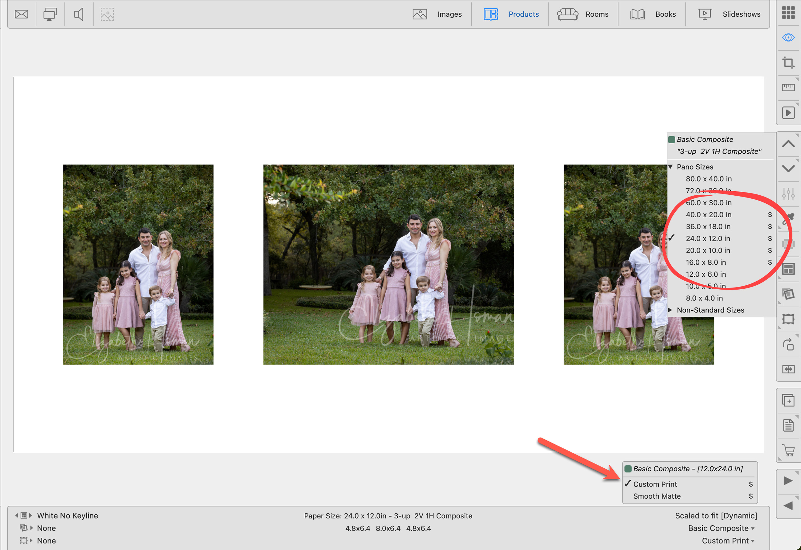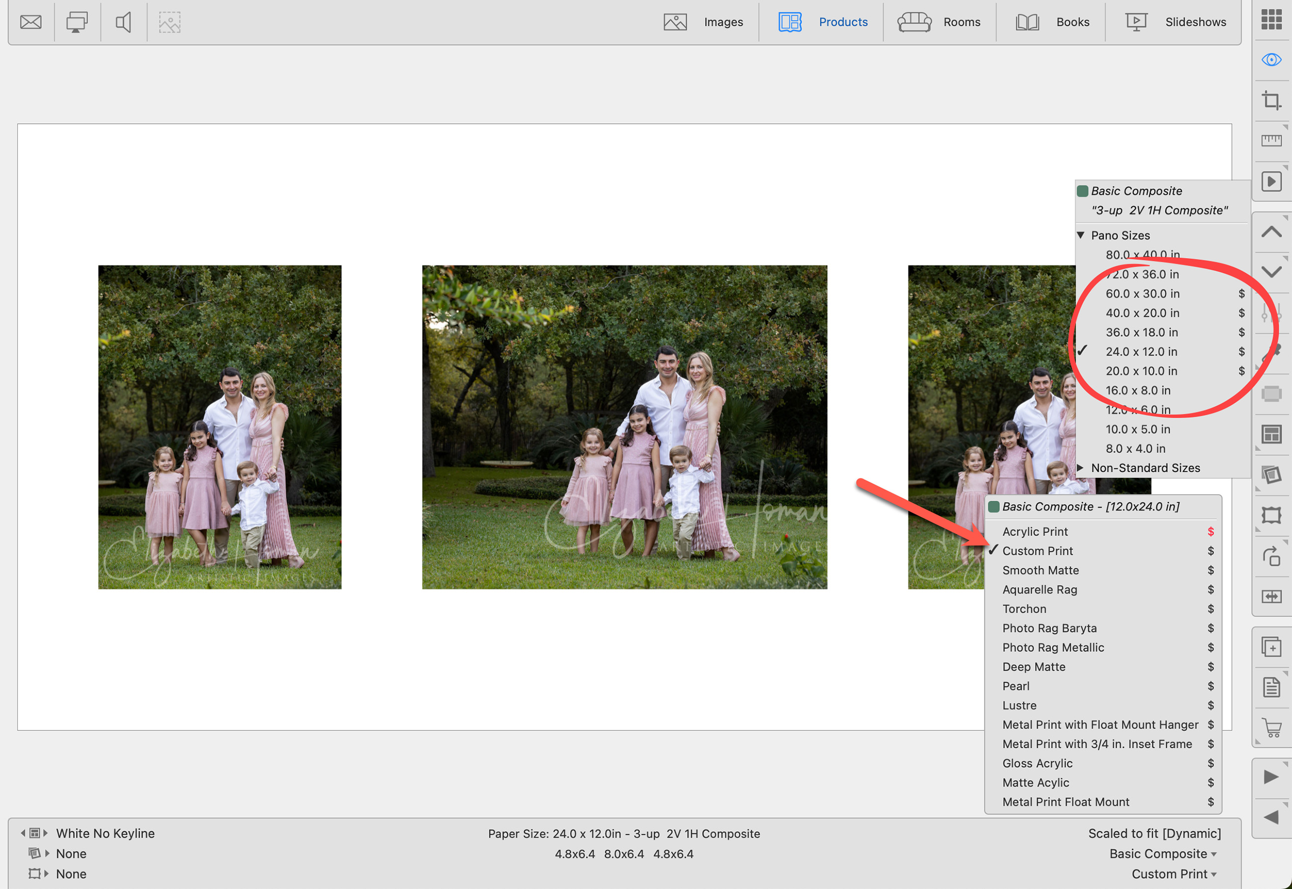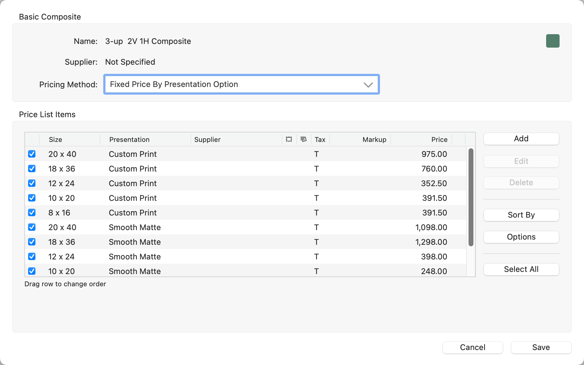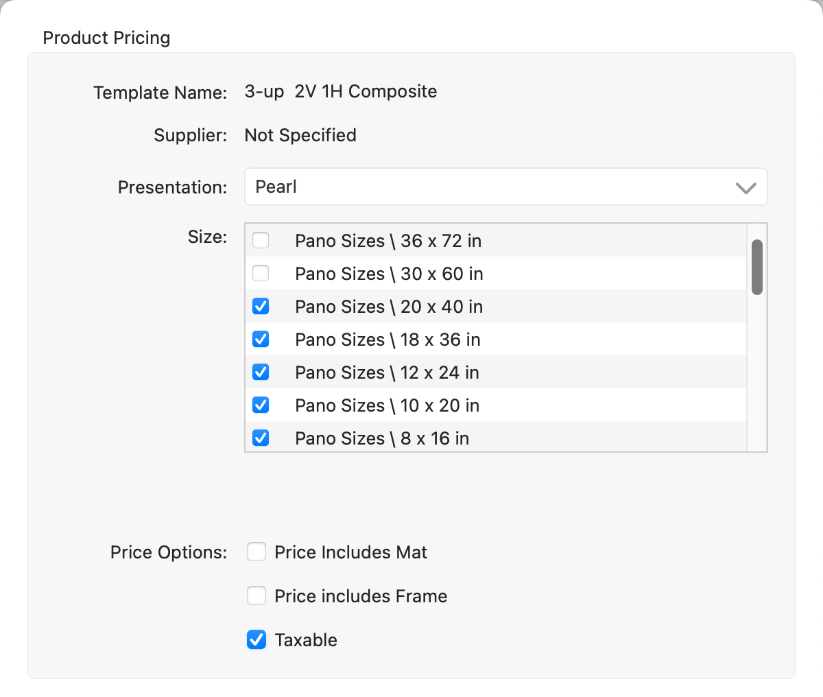 2. Sum of Parts: This method works by matching the overall size of the product template to a similarly sized print you've already priced.  This approach ensures that the price of the product is determined by the paper size and presentation option that corresponds to existing print pricing.  Essentially, once you have priced your standard prints, the pricing for composites of the same size is automatic.