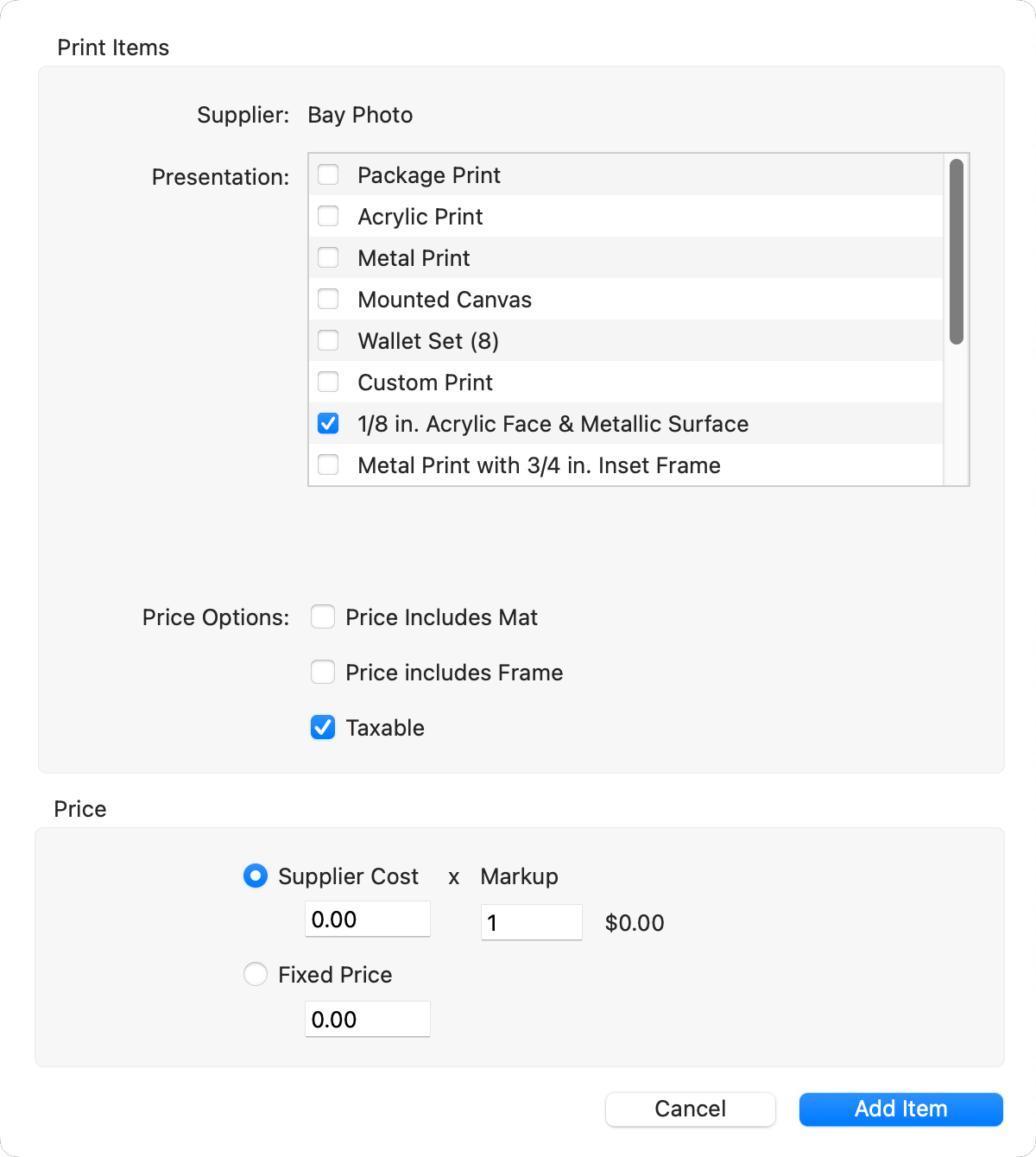 Choose Either Supplier Cost x Markup or Fixed Price.  If you add the pricing in this dialog, the price will be applied to ALL presentation options added.  Alternatively, price each one individually after adding them.