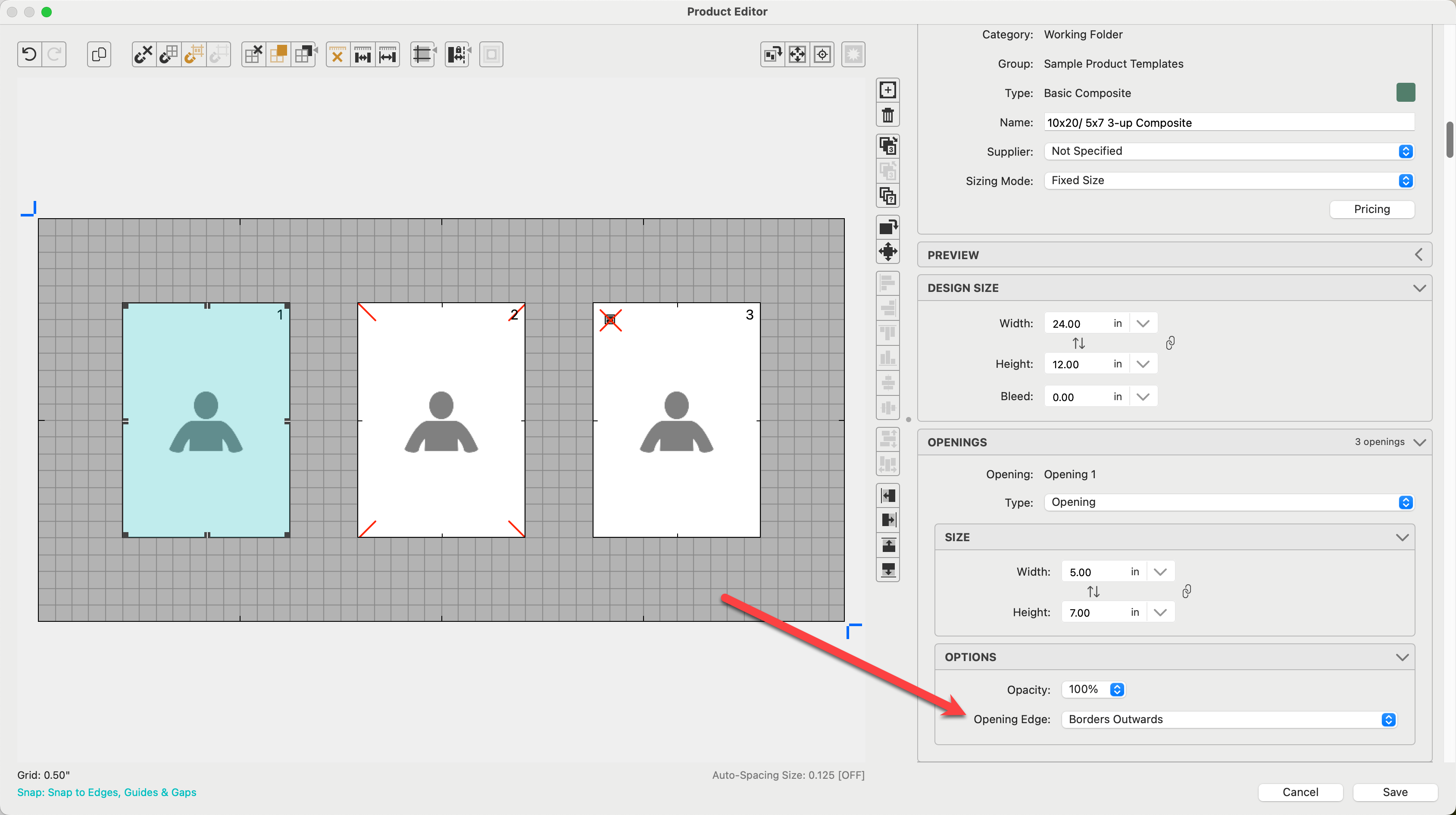 For advanced product templates, the Openings section and Options sub-tab give you control over the edge treatments for each opening. By default, "Borders Outward" is selected, where any border enhancements like keylines or bevels extend outward from the outside edge of the opening.  Alternatively, choosing "Borders Inward" causes these enhancements to move into the image area, reducing the visible image area and altering the aspect ratio.