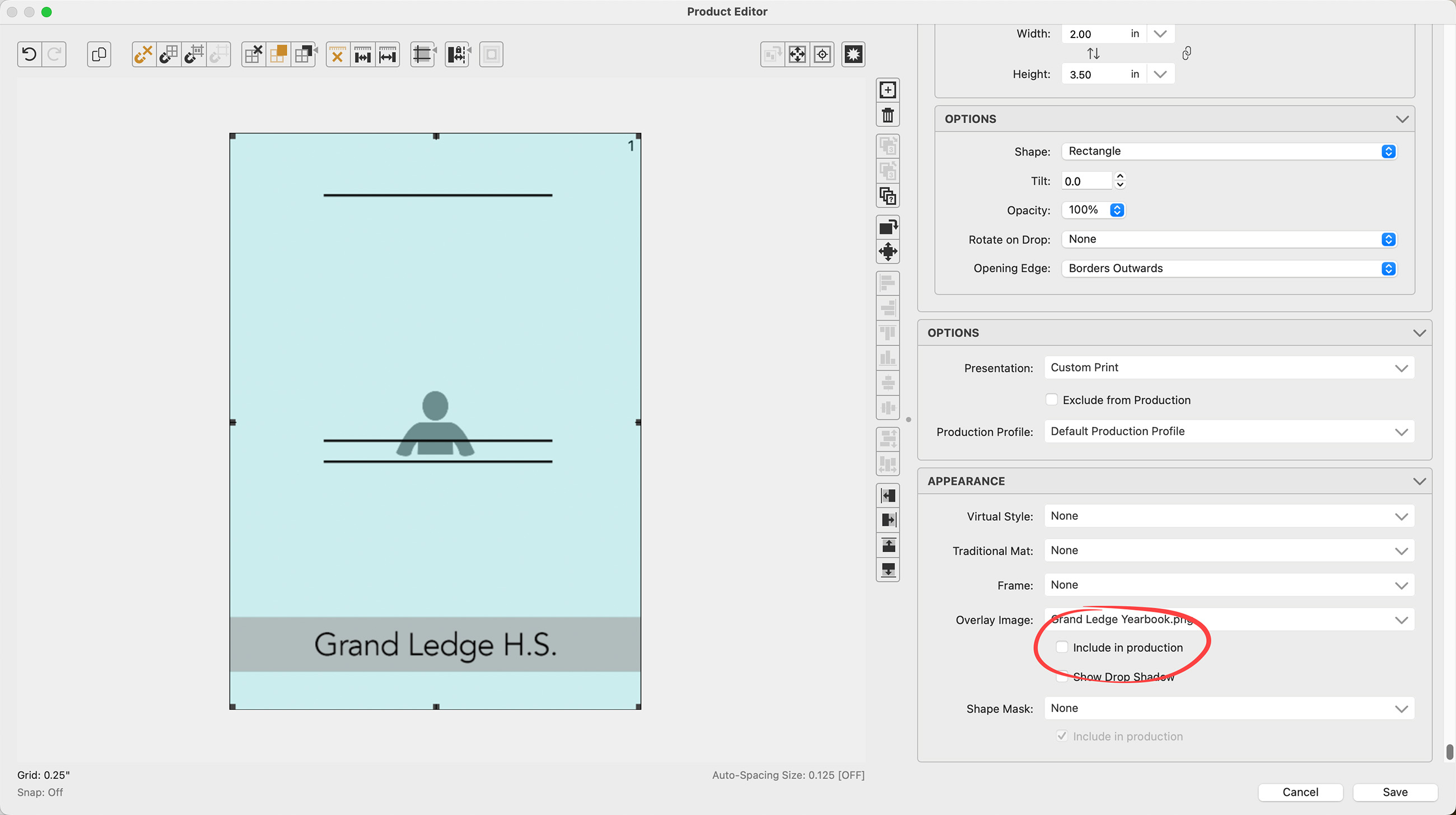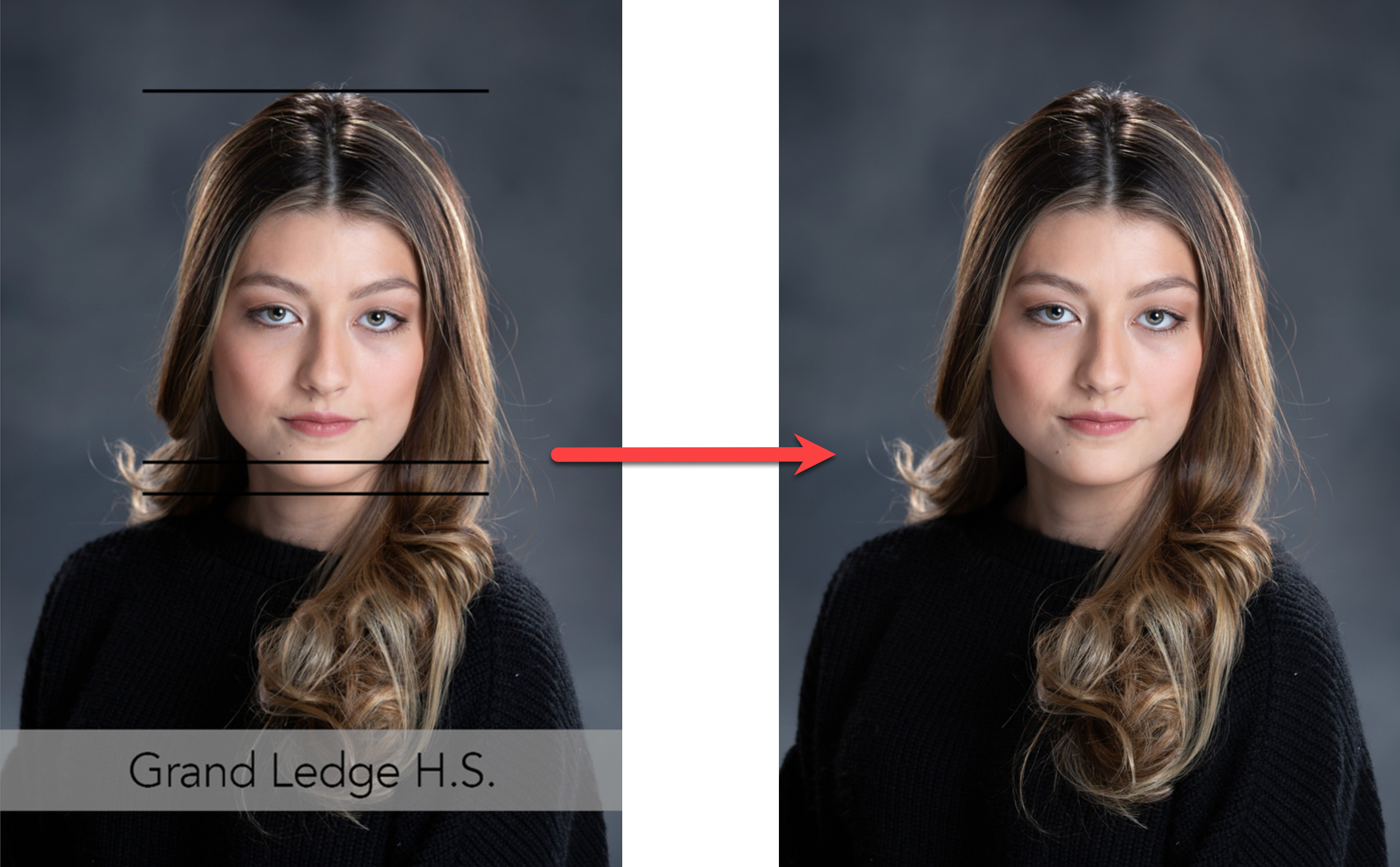 The "Include in Production" option for Overlay Images and Shape Masks allows an overlay to be ignored during the final production process. In the given example, the overlay is used to correctly set the head size for a yearbook photo. The information on the overlay is only necessary for accurate ordering during the sales session. When production is executed, the overall image size, head position, and size will meet the required specifications precisely.