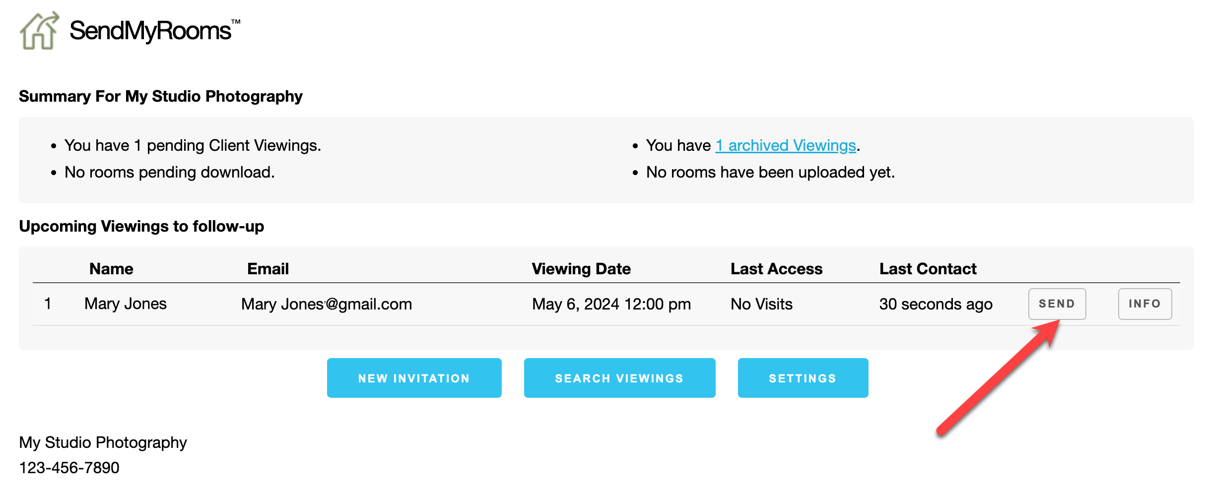 - From here you can Send a New Invitation, Search Viewings, or access your Settings.