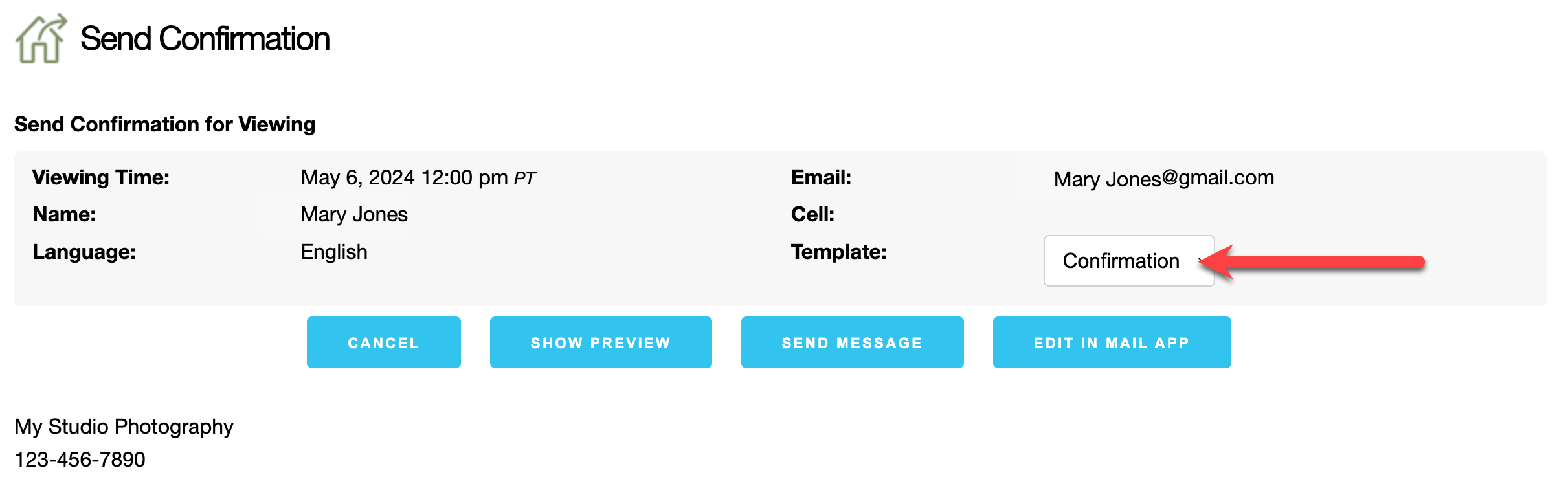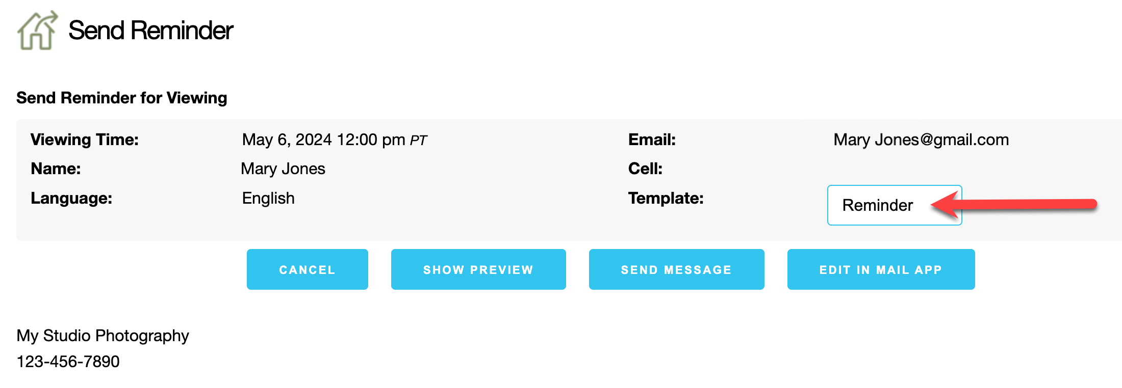 When rescheduling a Clients viewing, use the Confirmation Email template if the Client has uploaded images already. However, if they have not yet uploaded room images, you can send the Reminder Email. This email template will also give the rescheduled appointment time as well as prompt them to upload room images. Use the Show Preview button to confirm the type of message you are sending.