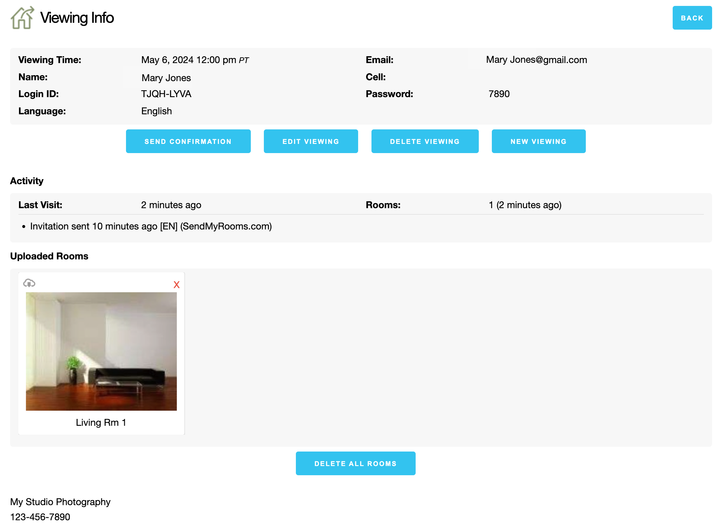 - Use the Info button to access information about the upcoming viewing appointment, as well as view uploaded room images.