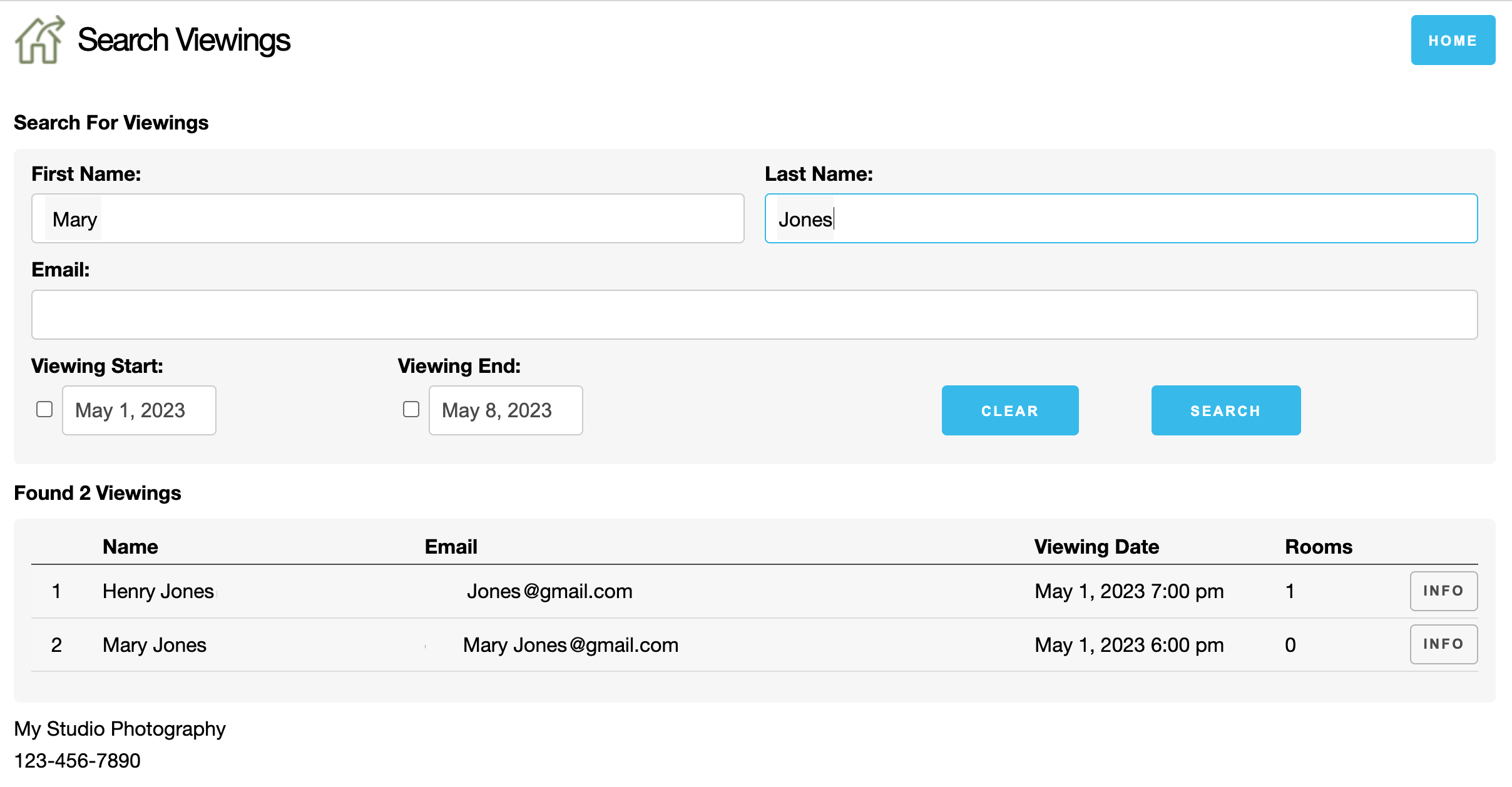 - In the system, you can search for viewings using full or partial names, email addresses, or by selecting a specified date range for upcoming or past viewings.