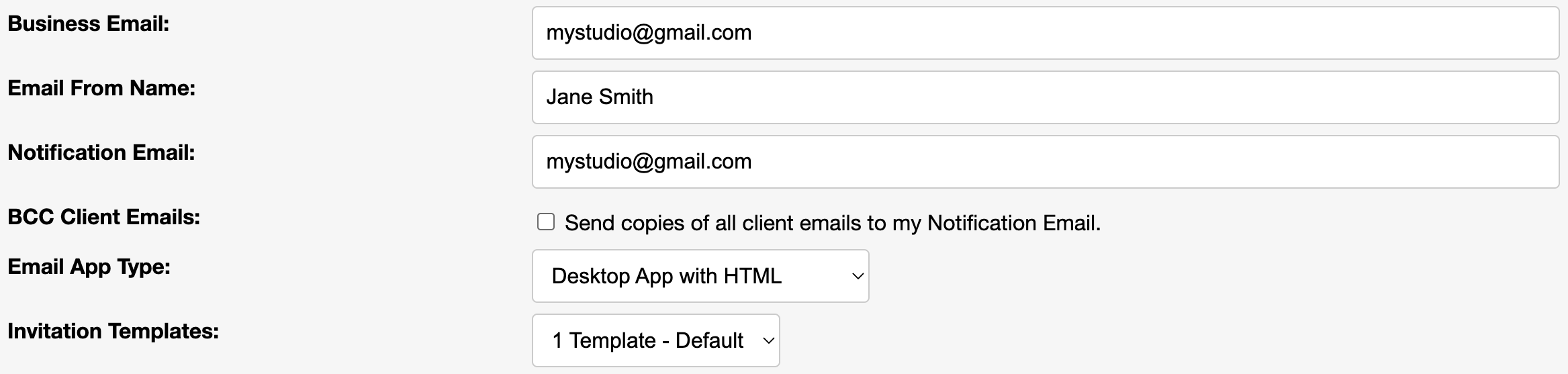 The is the “From” name in all emails sent to your clients. It defaults to your Business Contact Name, but you can set another name here.