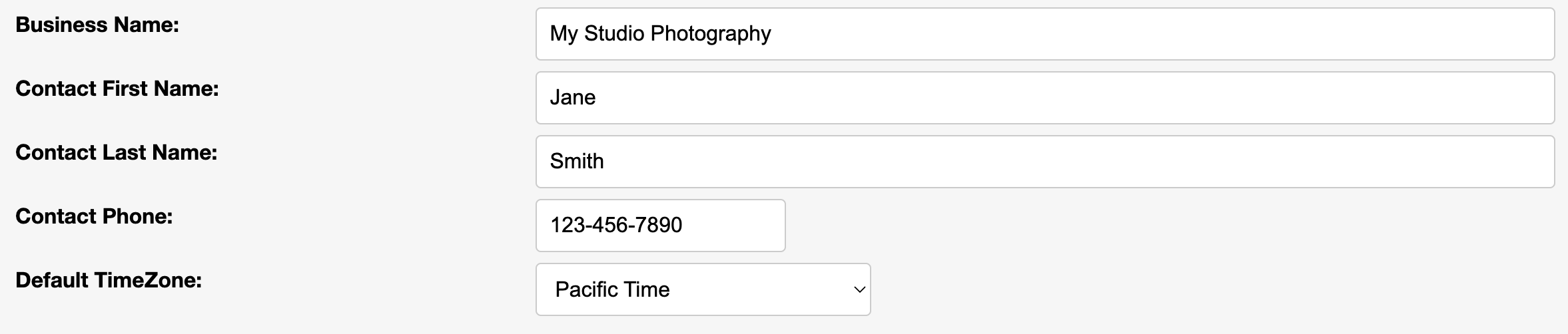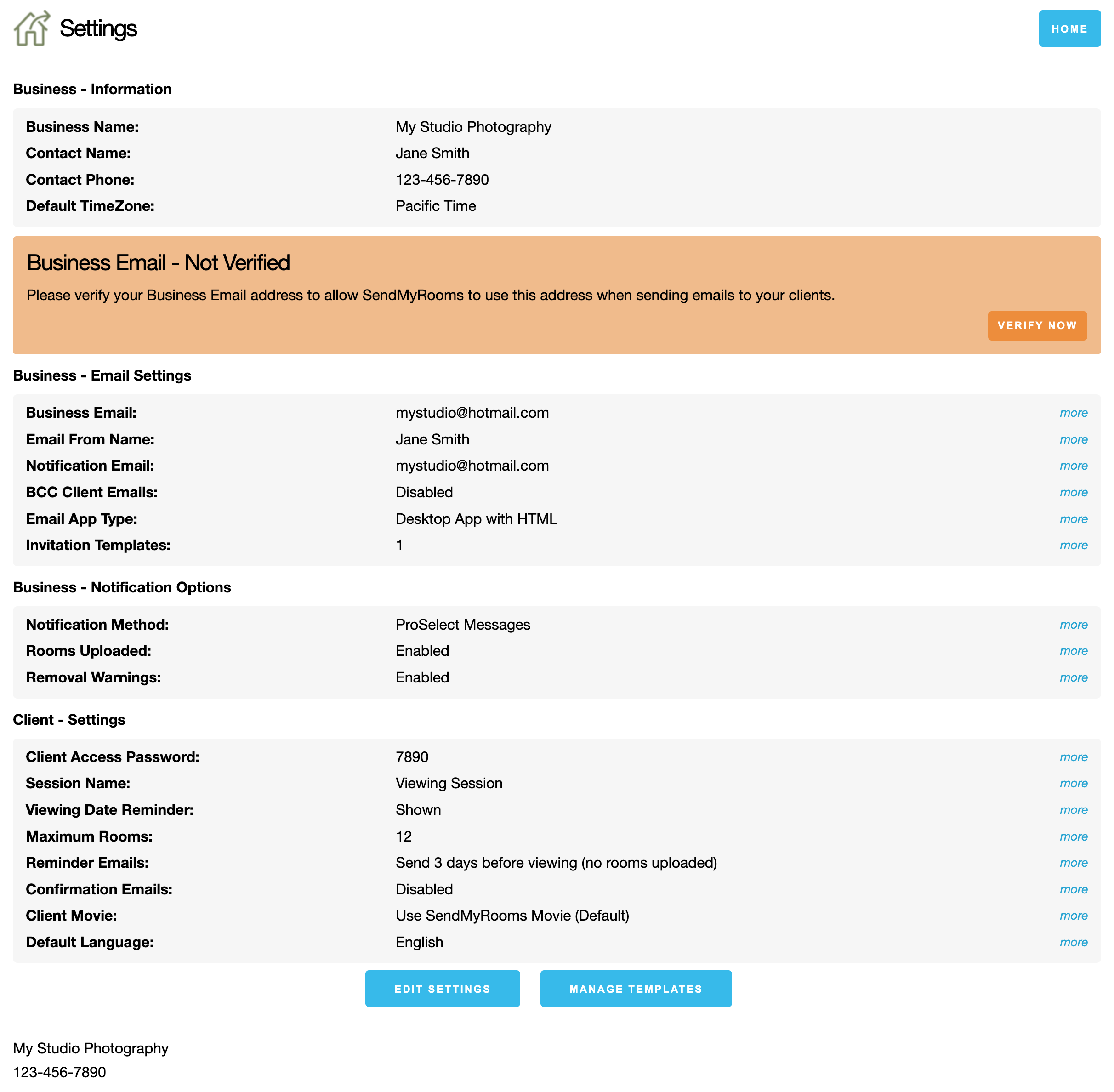 Your Business Name, Contact Name, as well as Contact Phone Number will be displayed on the Client Areas of the SendMyRooms™ website. They will be automatically inserted into the emails you send to Clients. You may wish to shorten a very long Business Name (no more than 25-30 characters) so that it will fit on the small screen of a mobile device.