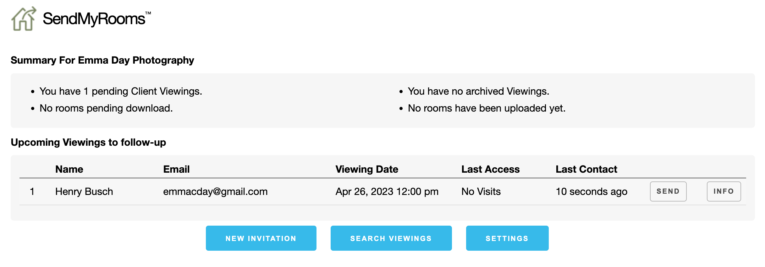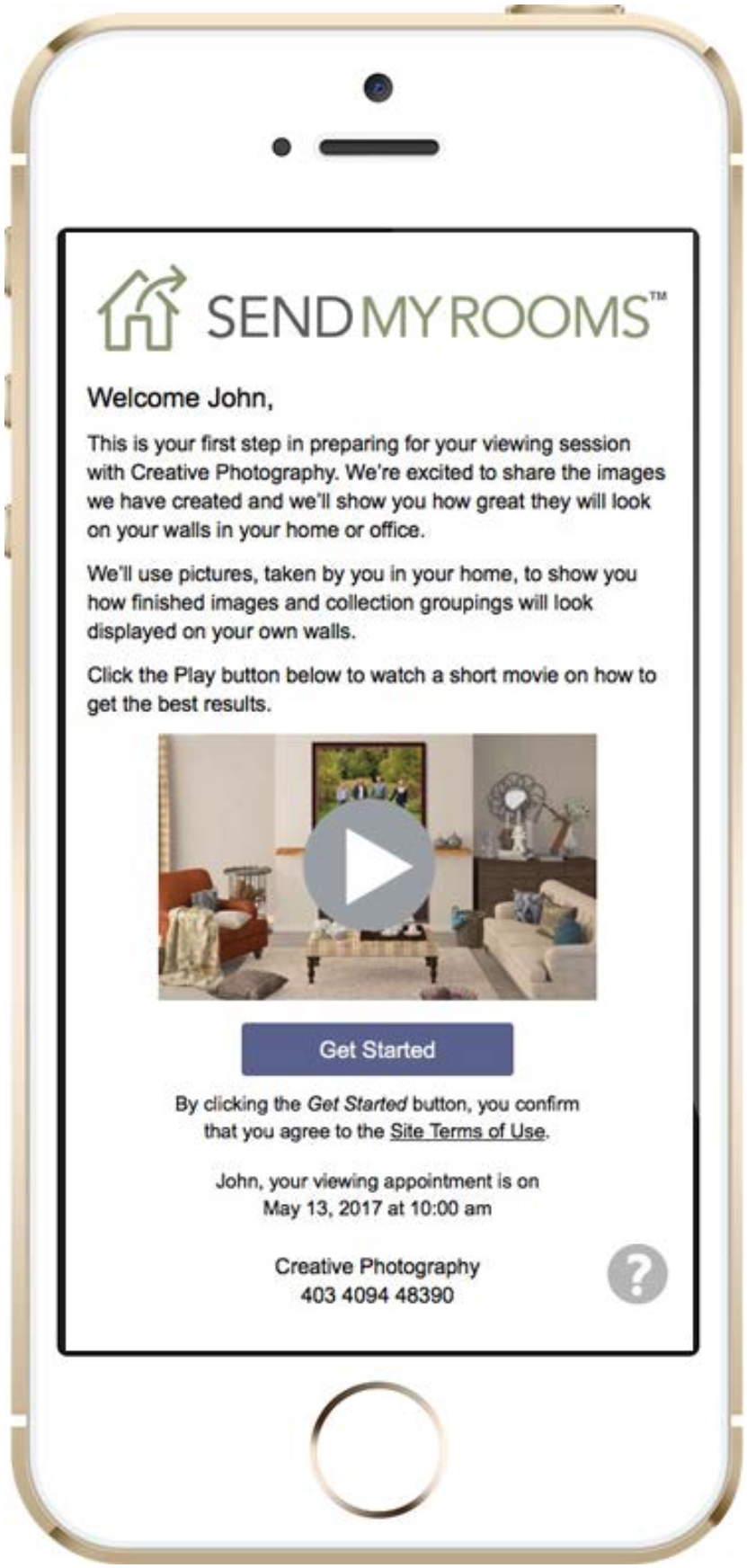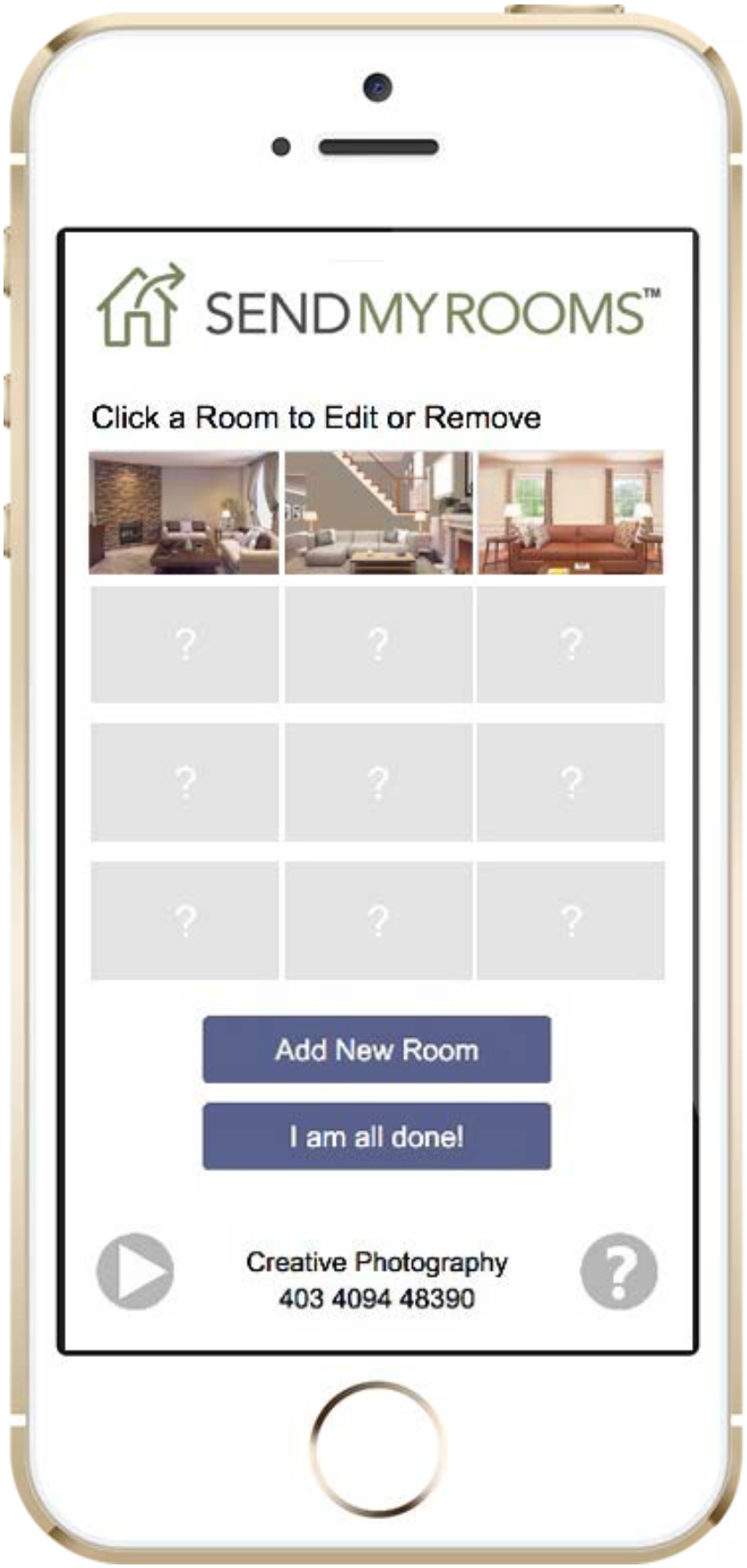 SendMyRooms™ is designed to make it easy for you to get your clients involved (and committed) to their photography session by providing them with an easy way to take photos of their rooms and instantly send them to you through its mobile-friendly website.  SendMyRooms™ has many features: