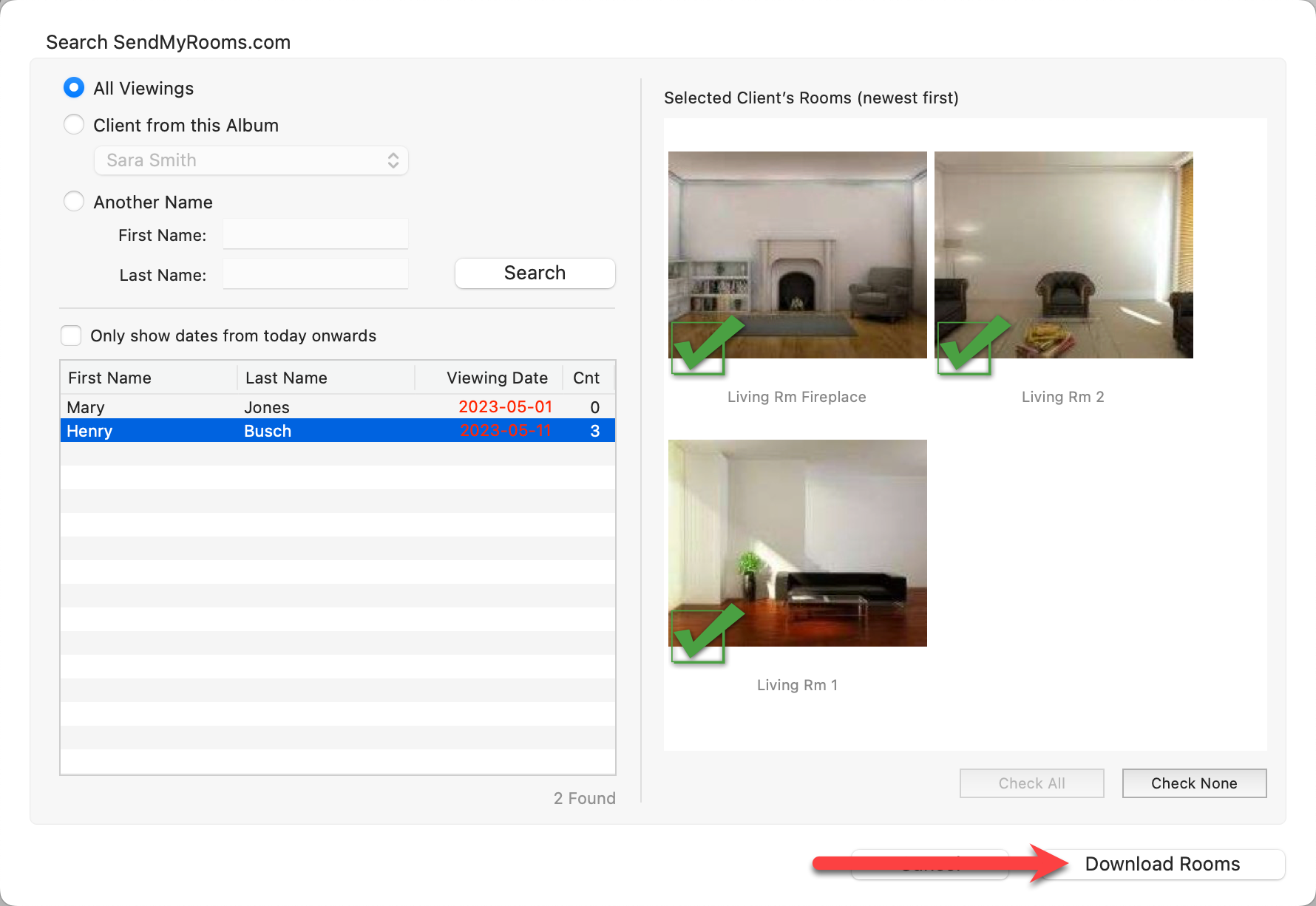 - Using the Search SendMyRooms.com window, you can search for a client's images in three different ways: